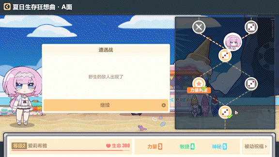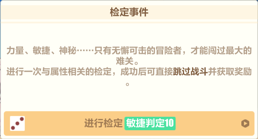 赐福精灵和治愈之泉则不需要战斗,可以直接获得奖励。不过活动内还拥有一个特殊机制——属性判定。在需要判定的路线里,遭遇战、团队战这两类若判定成功,则可以直接跳过战斗并选择新的技能。而在赐福精灵中,判定成功可以额外获得一次选择技能的机会,所以选择属性合适的角色也可以减少通关的难度。