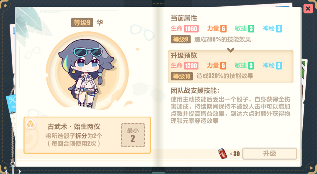每个角色都拥有自己的独特的骰子技能、支援技能和三种属性。因为角色不同,所以三种属性的偏重也不同,不过战斗中这三种属性并不影响伤害,而升级带来的技能效果提升可是实打实的。