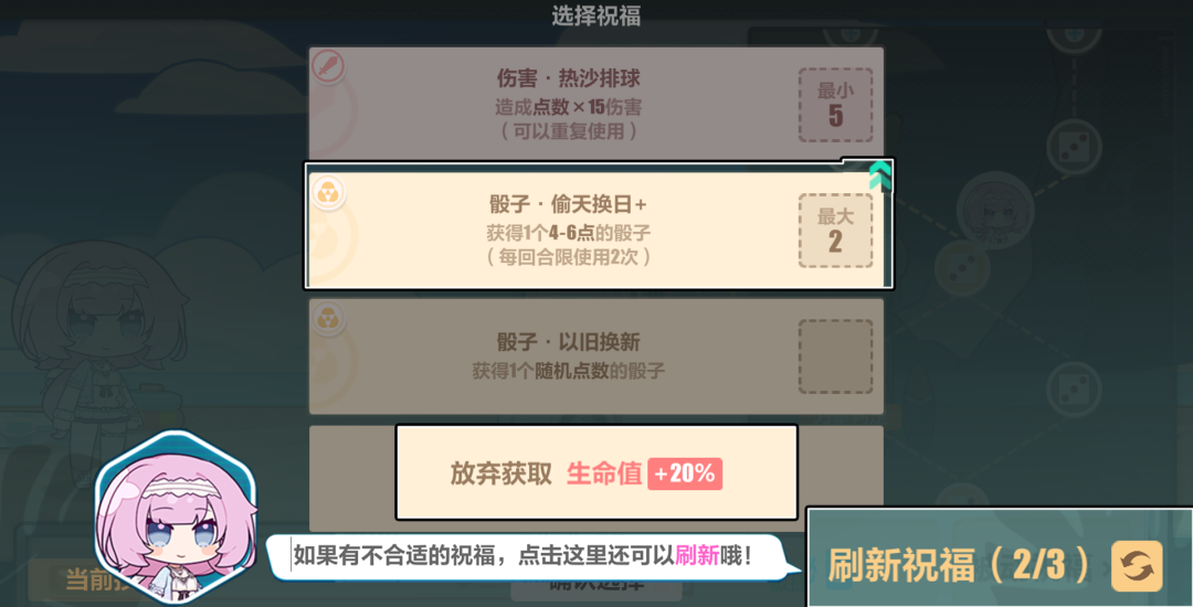 除了容易被遗忘的刷新之外,生命回复也是重要的一环。因为被动技能的选择没有上限,而主动技能最多只能选择三个,所以若是想恢复生命值,建议在主动技能都不想要时选择回复。同时主动技能还拥有着升级的功能,当刷出重复祝福时,右上角将会标注出绿色的升级箭头,这时候获得不仅不会顶替掉其他祝福,还会增强该技能的效果。