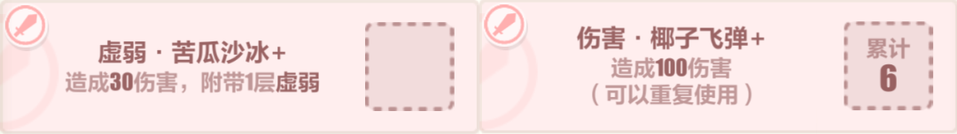 手上有小点数骰子时,二者都可以发挥出不错的作用,前者“椰子飞弹”可以积少成多,在下一回合打出伤害;后者则是不看点数的固定伤害,可以使敌人伤害变低。