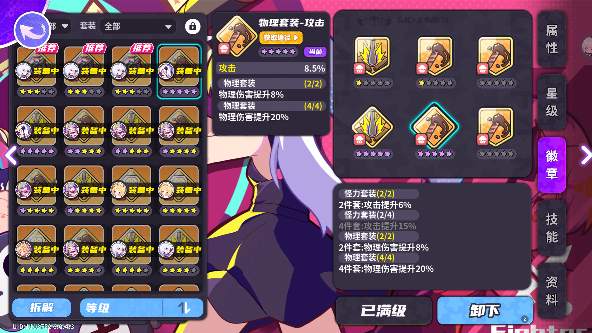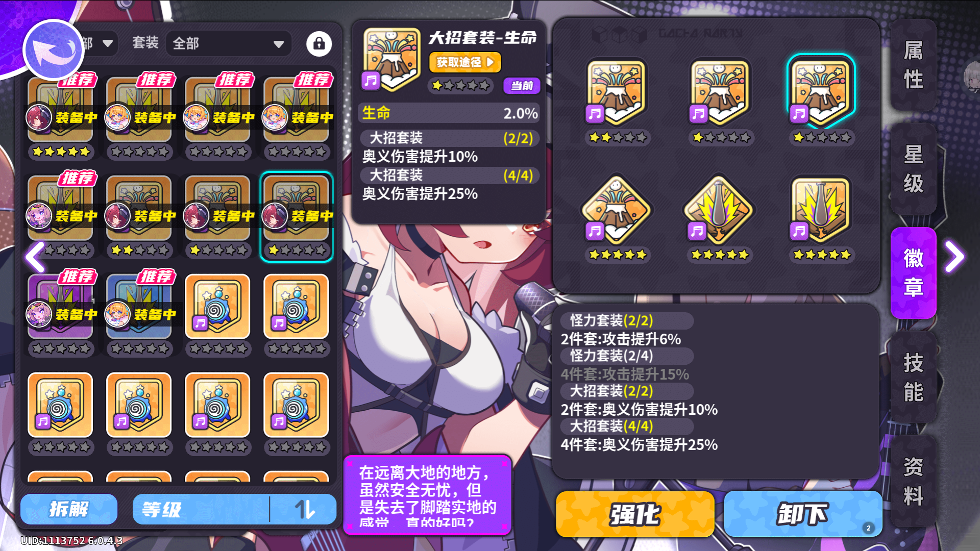 原因:你游目前没有减伤手段,也没有角色增加受到治疗手段,大师难度下的关卡星级也并没有要求角色不能损失角色,反倒是攻击力低了怪物堆叠血量会掉的更快,所以除了贪吃天使能自己回血的,重金属吉他这种竞技场PVP常客对属性有较高需求的,以外所有角色我都不推荐在刷完其他角色徽章之前升级任何盾形生命徽章,对应属性加成始终强于怪力套装的增伤