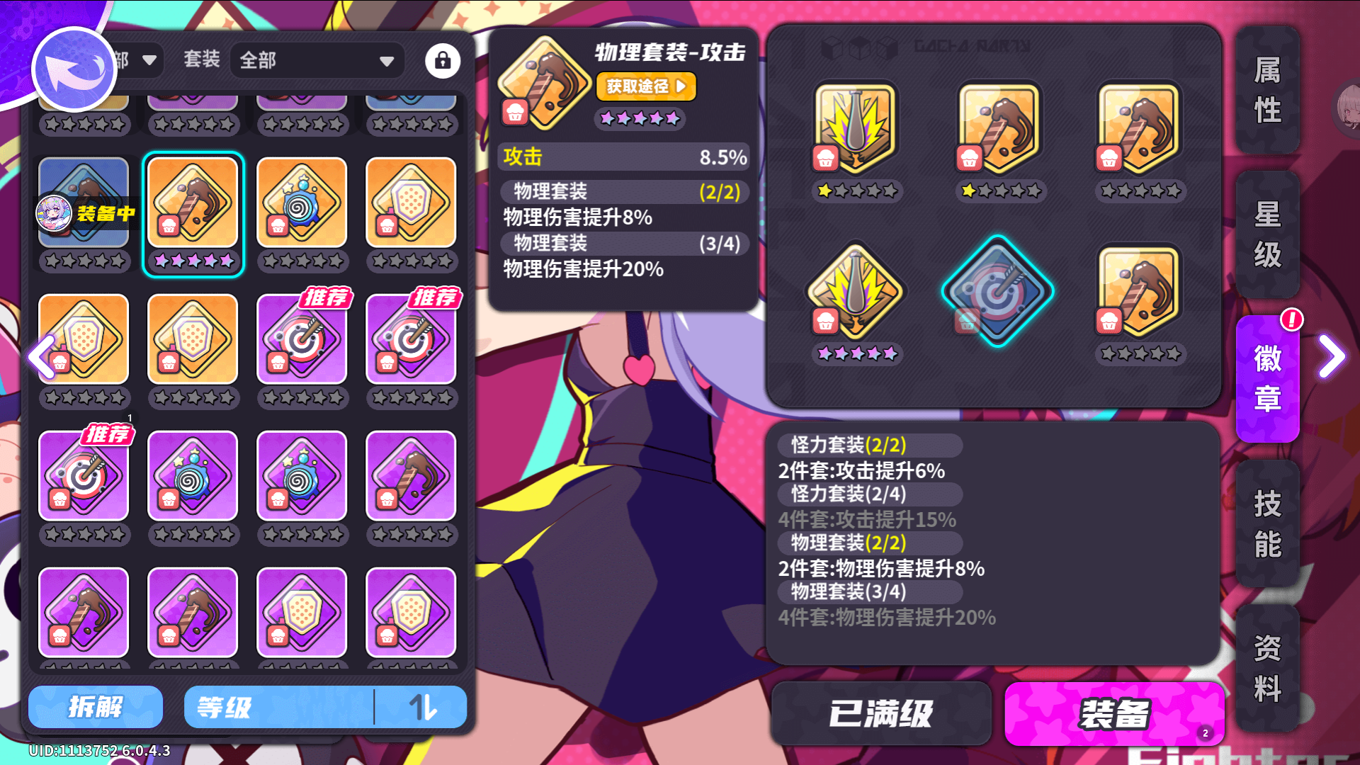 推荐:战士职业优先刷取菱形升级增加攻击力的徽章,再考虑升级别的角色攻击力还是再去升满盾型生命升级徽章,查看技能名确定伤害类型刷取对应的伤害增伤套装