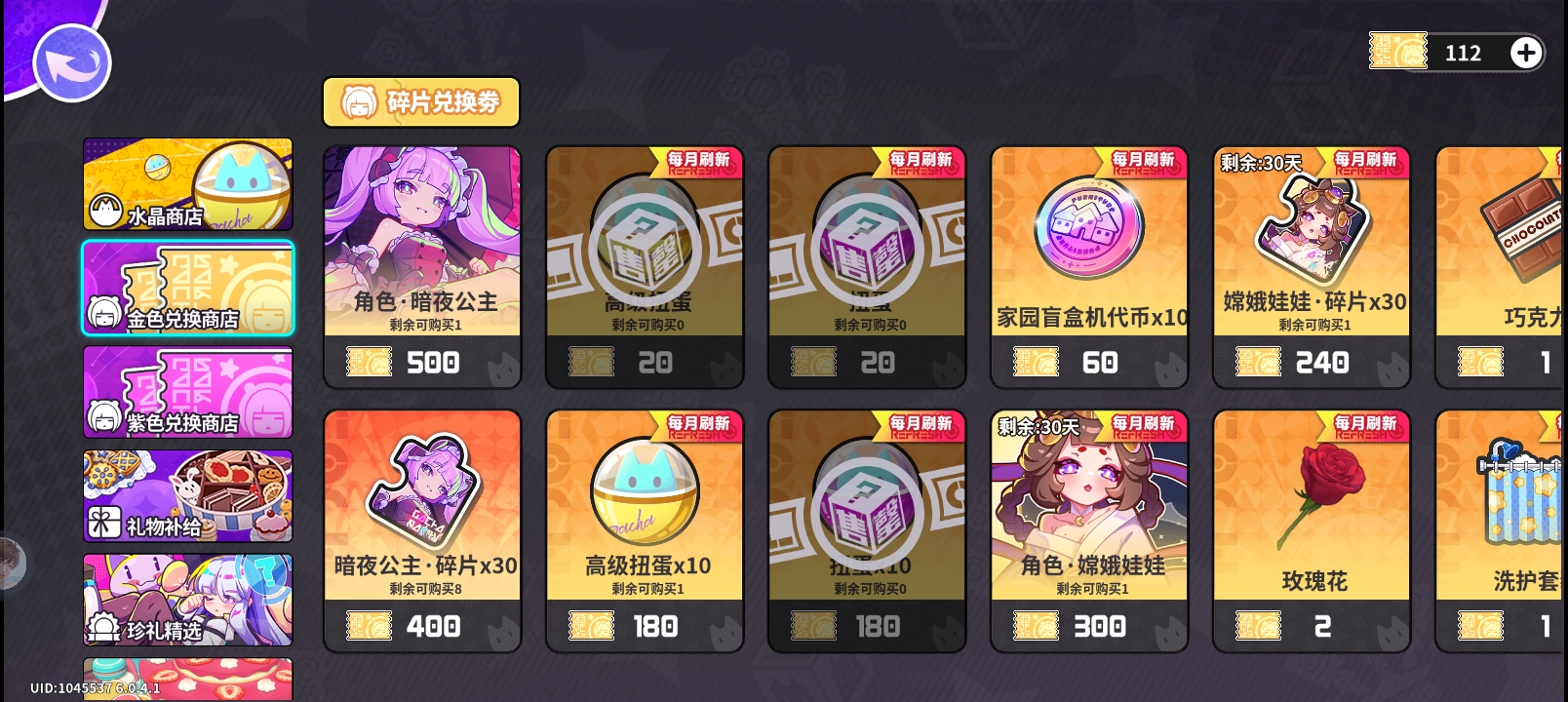 要换扭蛋的话先180换10个限定扭蛋,暗夜公主光系辅助虽然贵,但是值得,估计也只有这里可以换了,可以不换扭蛋攒着换她