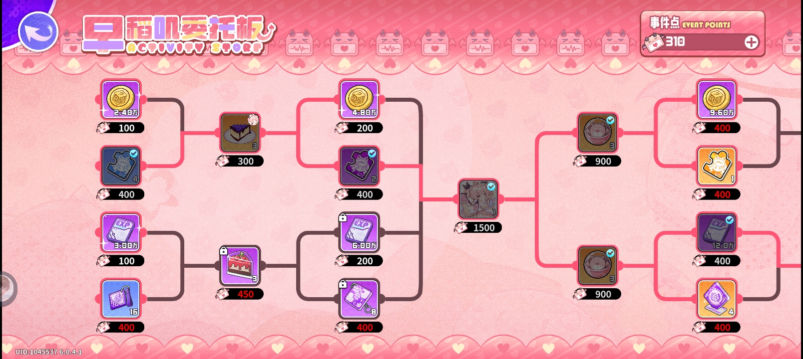 这里面有价值的只有扭蛋,第1层是400(用于买扭蛋)+440。第2层是500+900,第三层不用买满开下一阶段是600,除扭蛋外其他东西可以忽略不计
