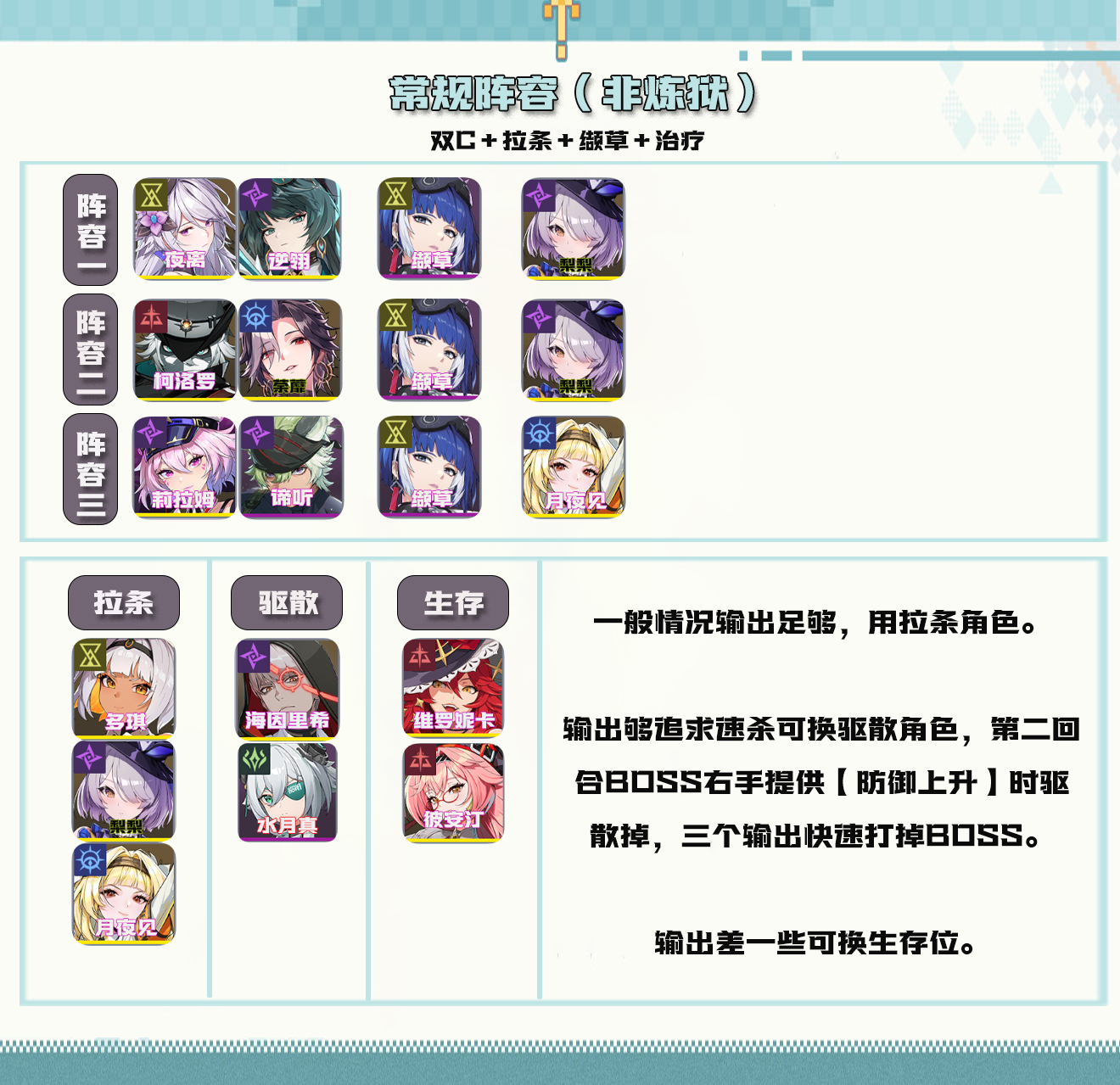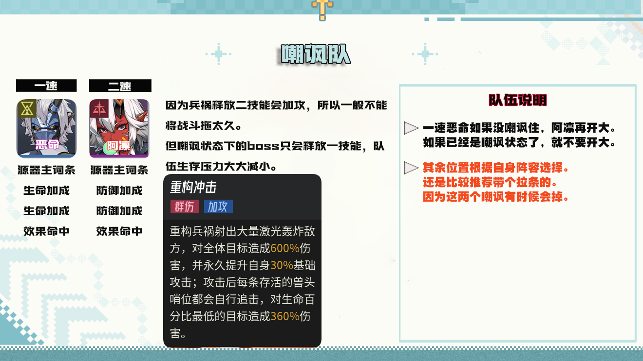 要求输出够(练度不够往下看),也就是C位练度要高。尽早击杀boss,避免被兵祸叠攻击减员一波带走。