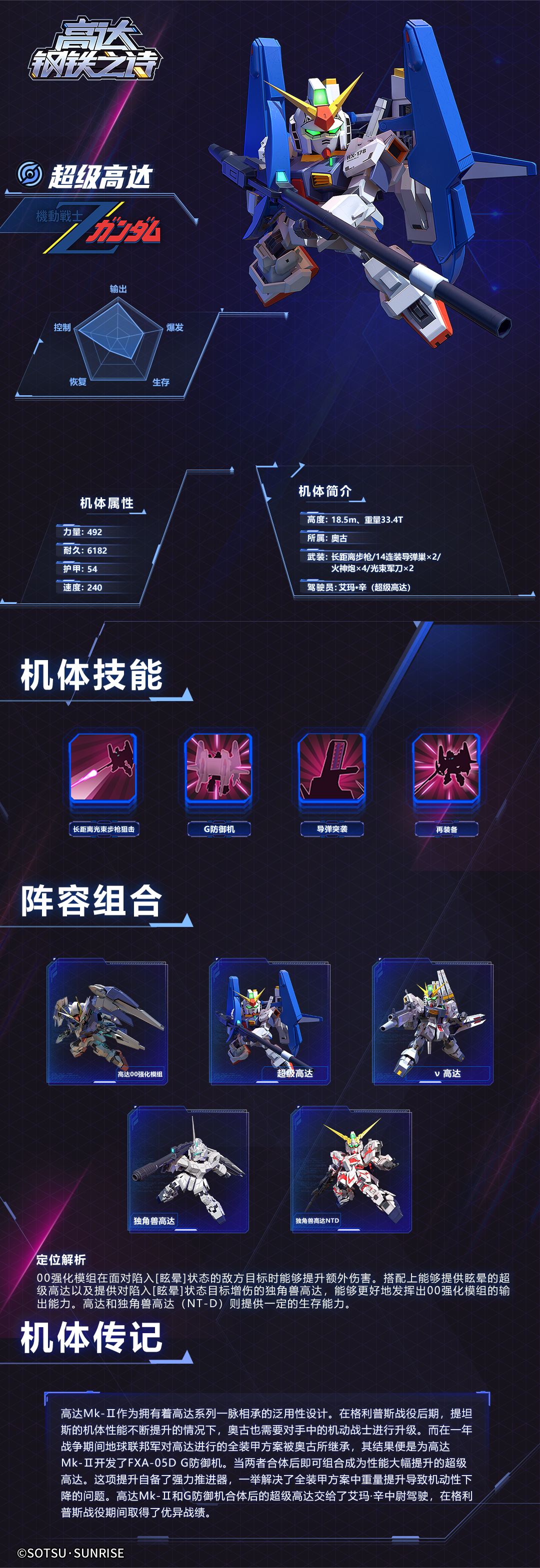 总的来说,超级高达是一款泛用性极强的控制机体。其核心优势在于它既可以为队伍提供控制效果打乱敌人的进攻节奏,同时凭借对眩晕状态敌人的额外伤害加成拥有不俗的输出能力。组队时如果拿不定主意,选择超级高达准没错的!