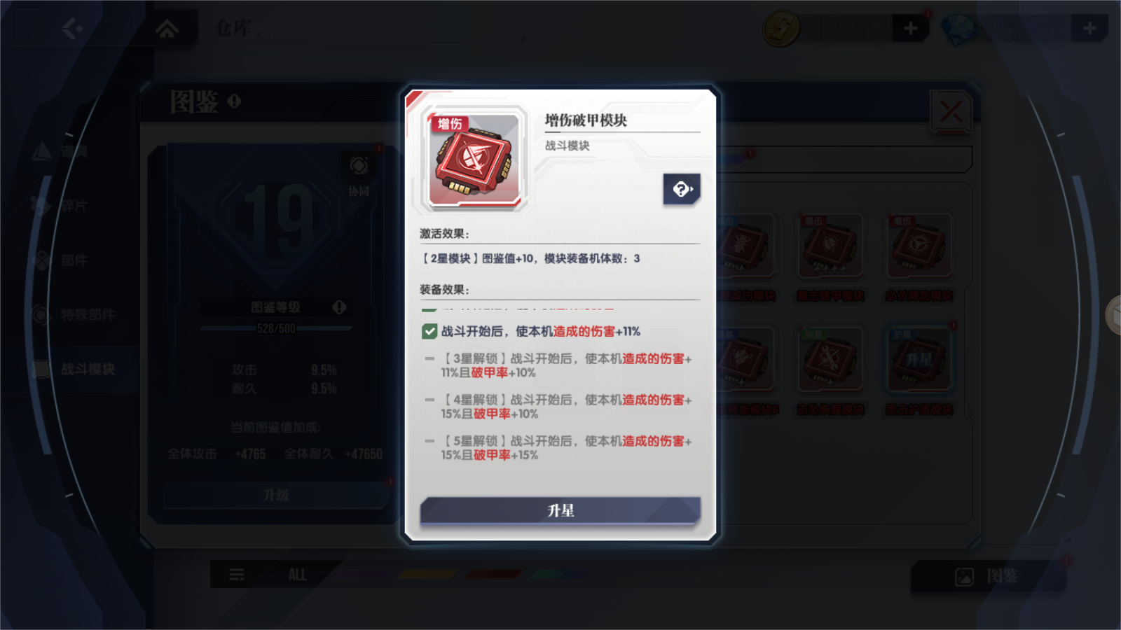 战斗模块方面,超级高达需要提升生存能力的同时通过控制干扰敌人。因此选择【减伤降攻模块】、【必杀降能模块 】、【必杀降防模块】搭配可以让他更多地给敌人削弱敌人,同时【开战眩晕模块】、【普攻吸能模块】和【必杀回能模块】也是相当不错的选择。