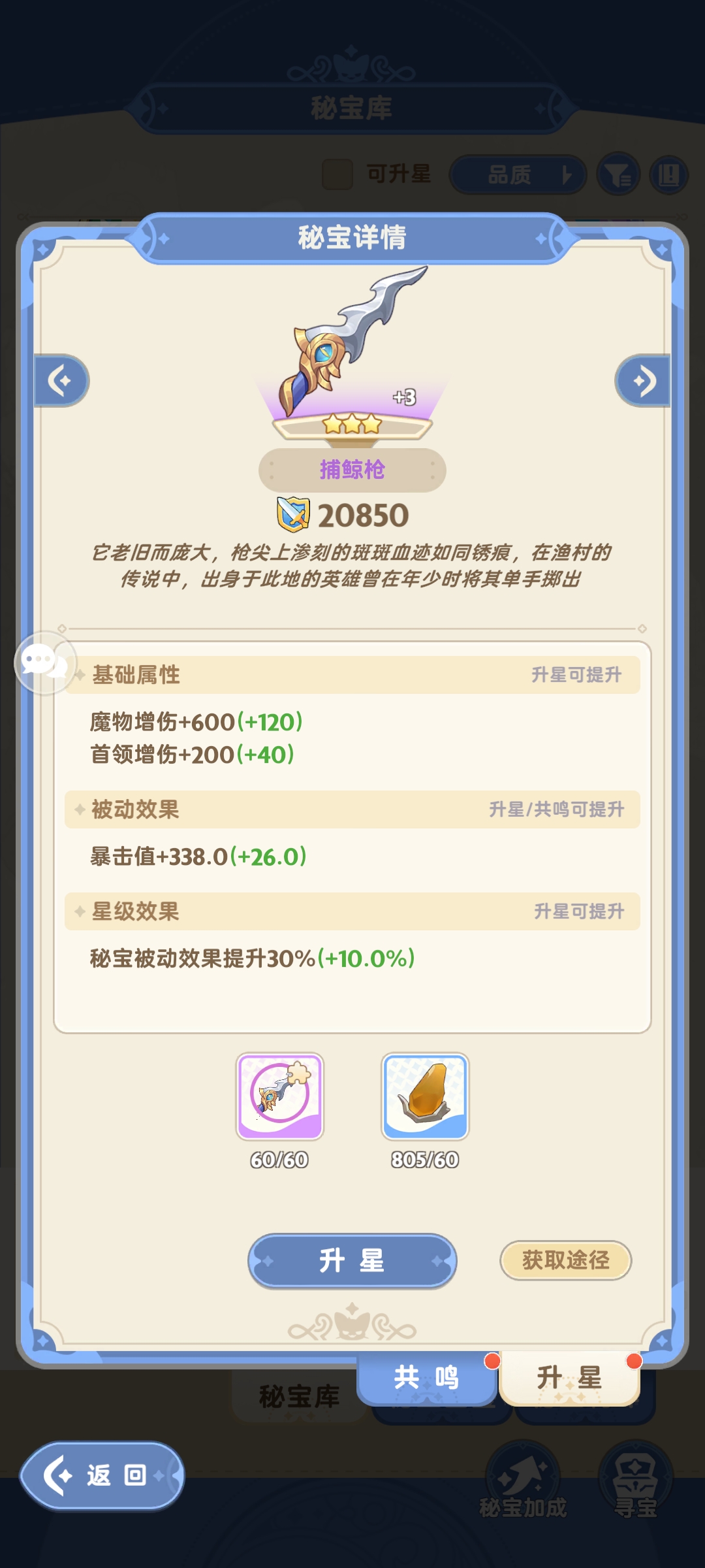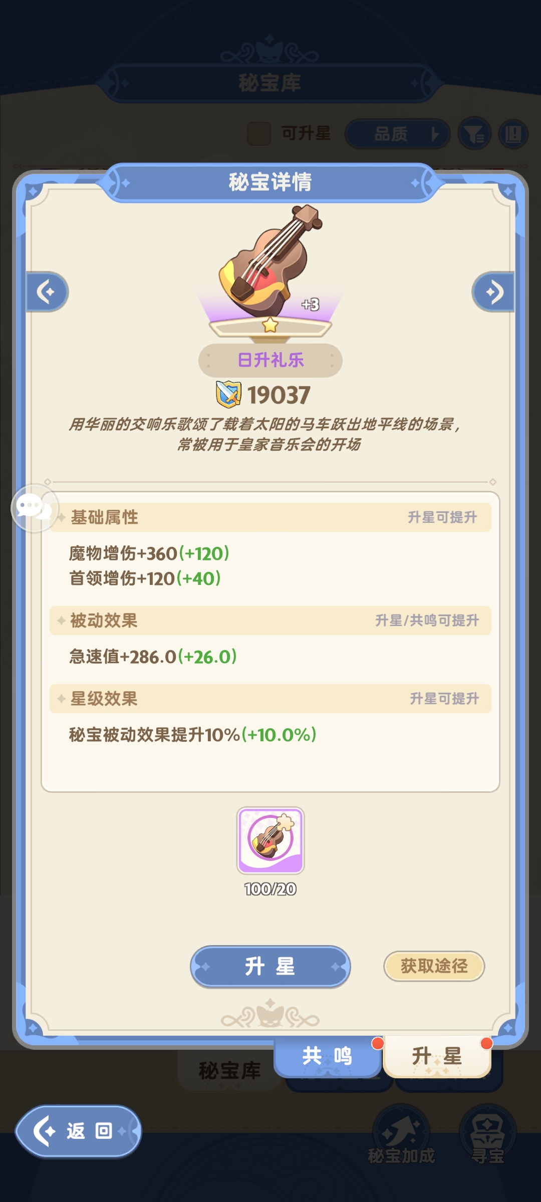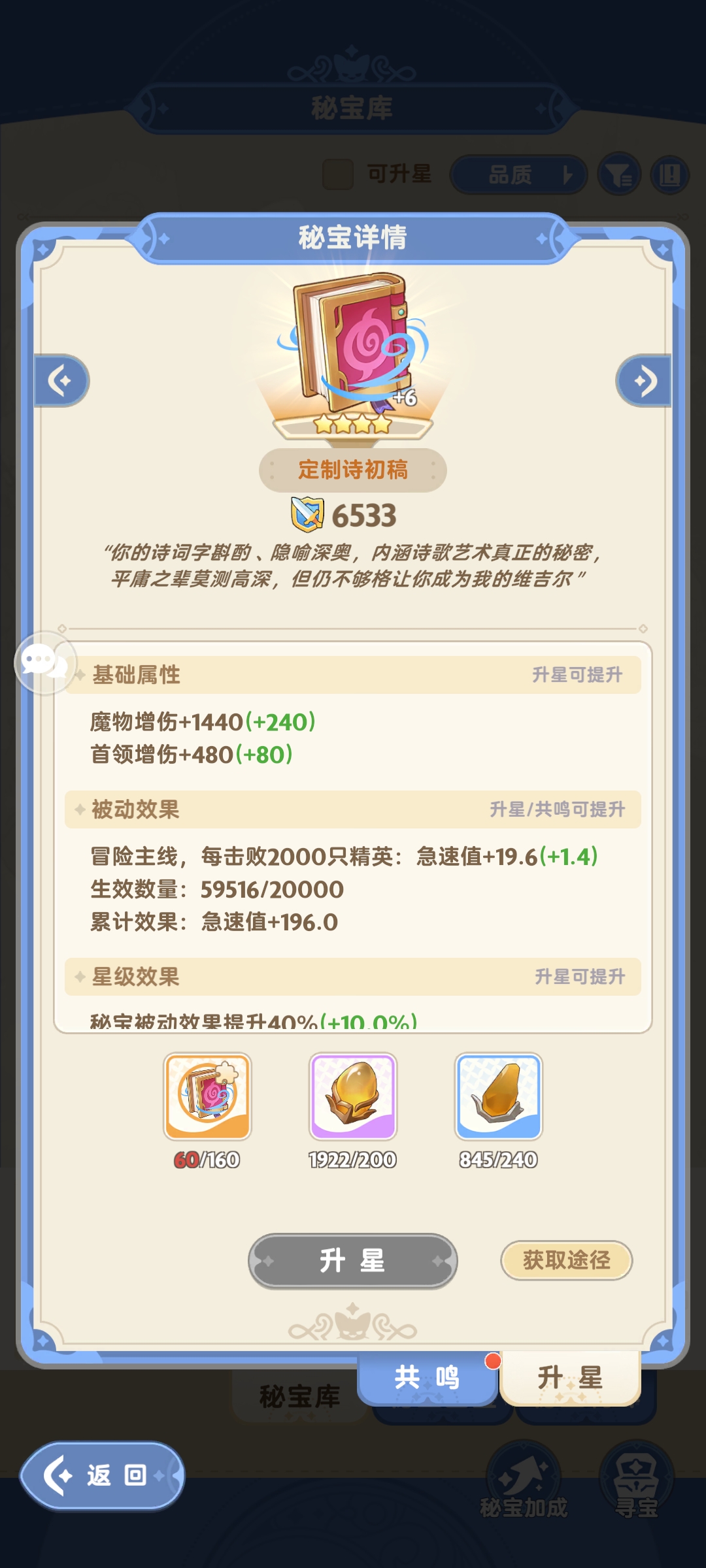 该游戏中,秘宝的升星和共鸣是无法被重置的,切忌不要哪里红了点哪里,下面介绍秘宝如何共鸣与升星,使其收益最大化。