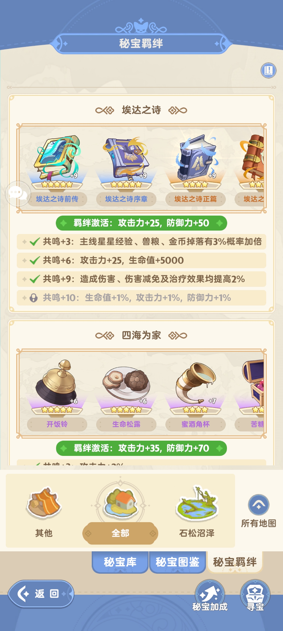 资源类获取翻倍秘宝(如捕风袋)和百分比伤害提升秘宝(如赞美诗)可以单独优先共鸣+9,以保证获取到最大收益。