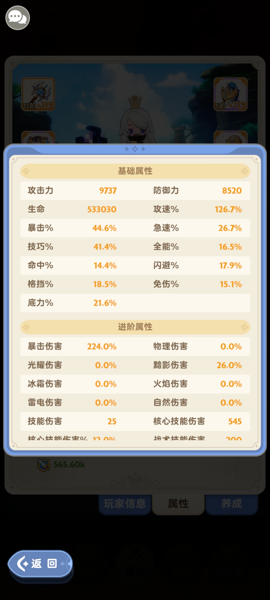 当然,这位大佬的应该是比较典型的没怎么去好好堆数据,什么属性都点,所以575战力才这些数据,正常这个战力的服侍应该都可以做到9000+攻击50暴巧了