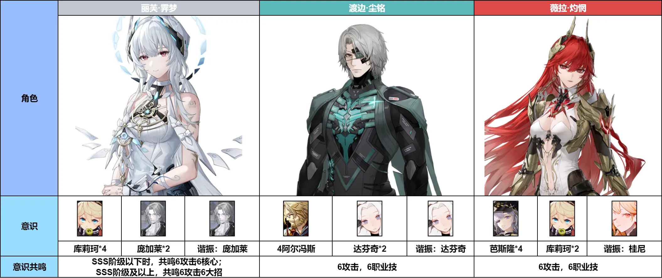 霁梦:4库莉珂4庞加莱,在SSS阶级以下时,共鸣6攻击6核心;SSS阶级及以上,共鸣6攻击6大招;