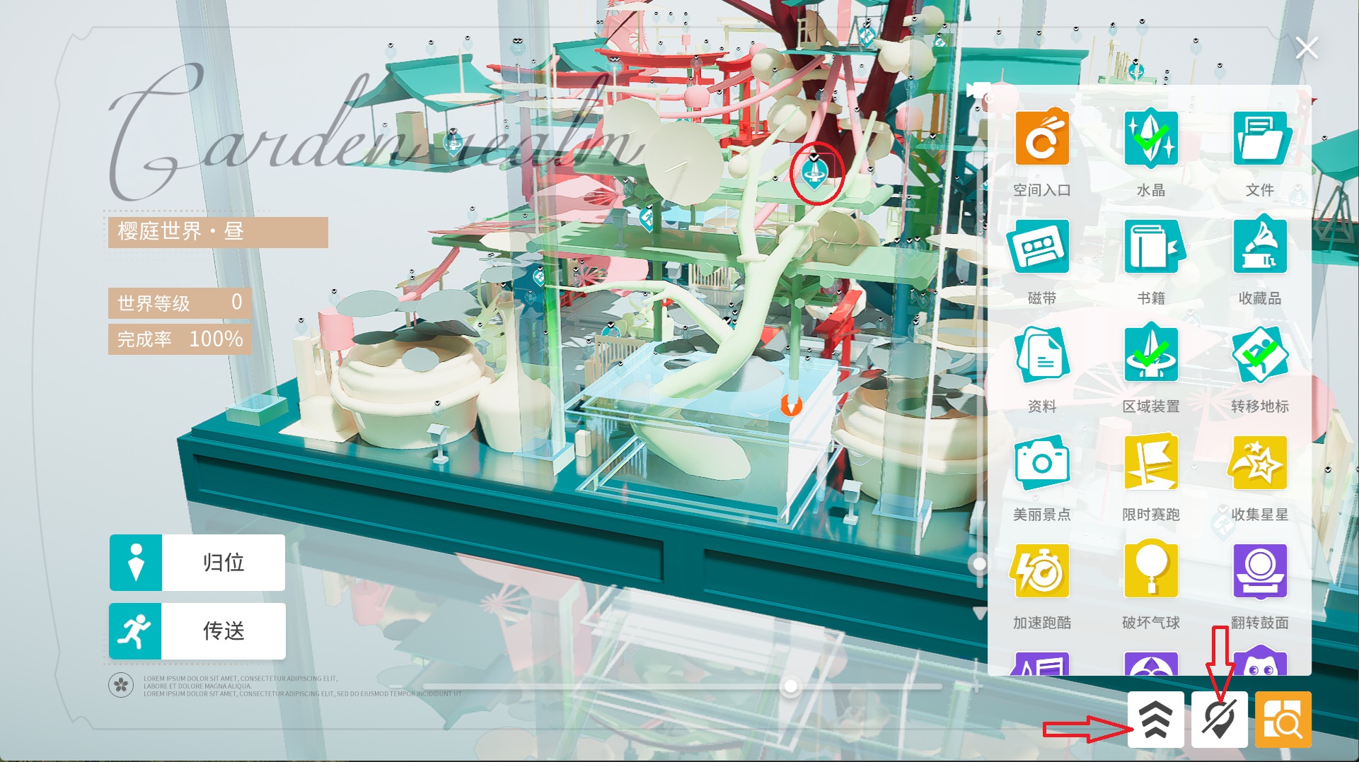就有各种收集要素的位置啦~点击“区域装置”或者“转移地标”,再点击那三个向上的箭头,就是传送到你选择转移的位置。勾选文件磁带书籍等等,明显能看到哪些没收集(高亮),点击你要找的东西,再点右下角第二个标记就能追踪,传送到附近屏幕上会有明显的黄色箭头指引。