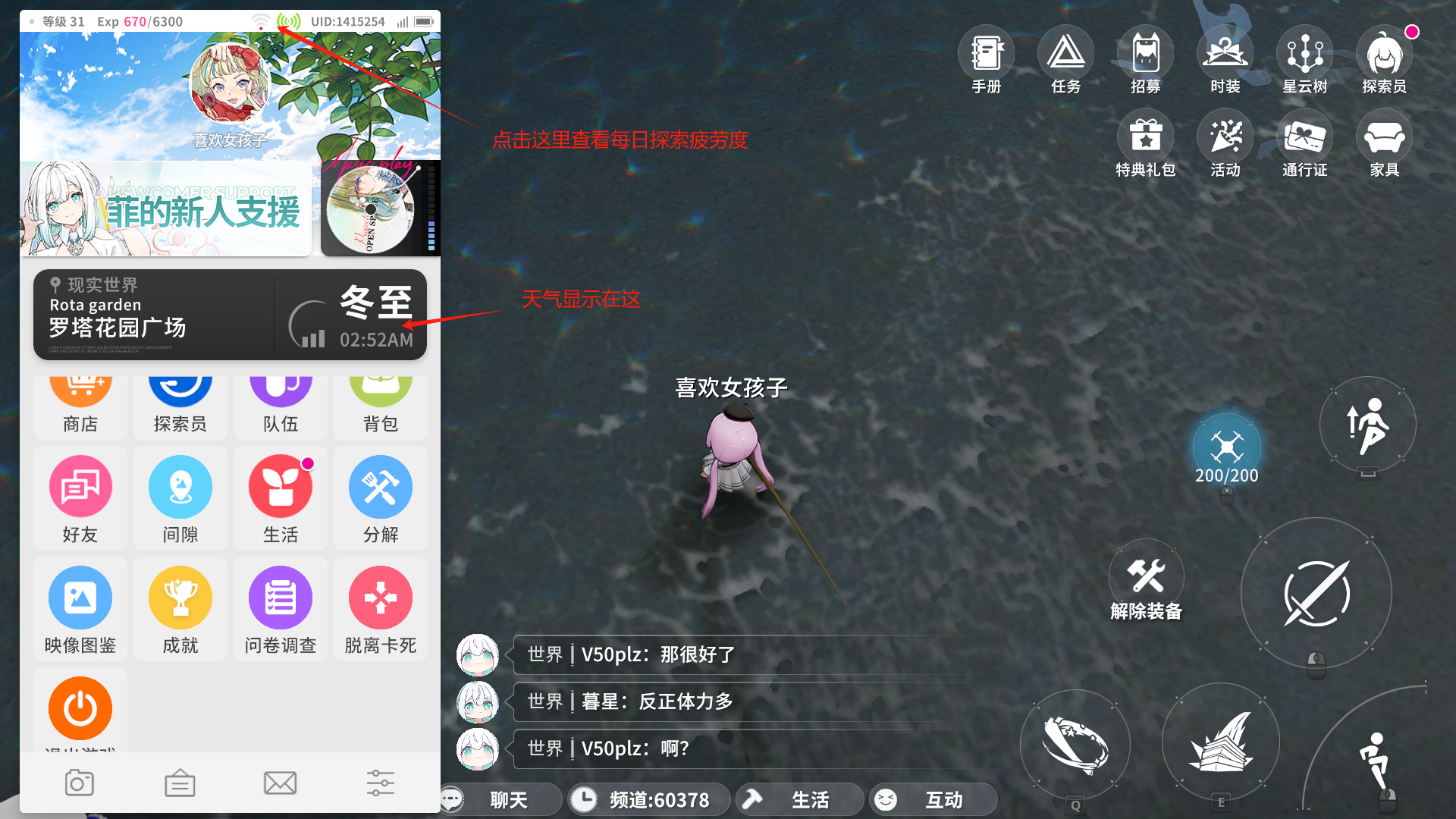 3.采集小技巧。如果转一圈发现没有自己想要的采集物,可以切换到其他地图再切换回主城,会刷新采集物。另外雨天大概两天下一次,白天夜晚各15分钟,也就是一小时下一次雨 时间随机