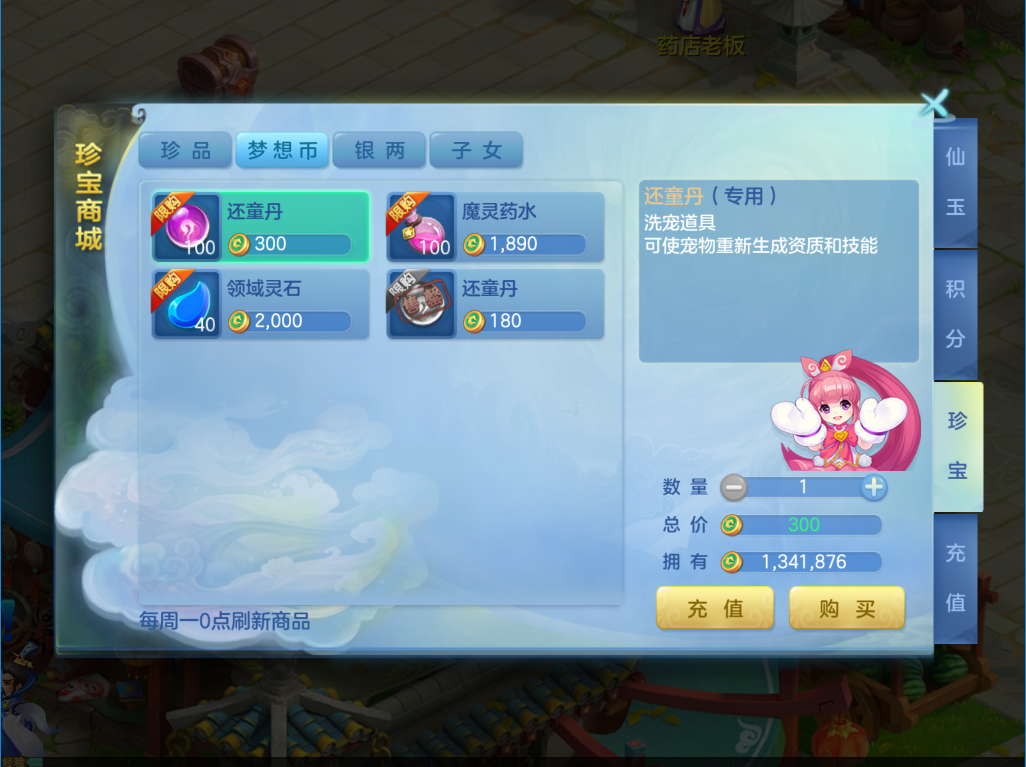 角色≥100级,增加了梦想币商城中还童丹的限购数量。