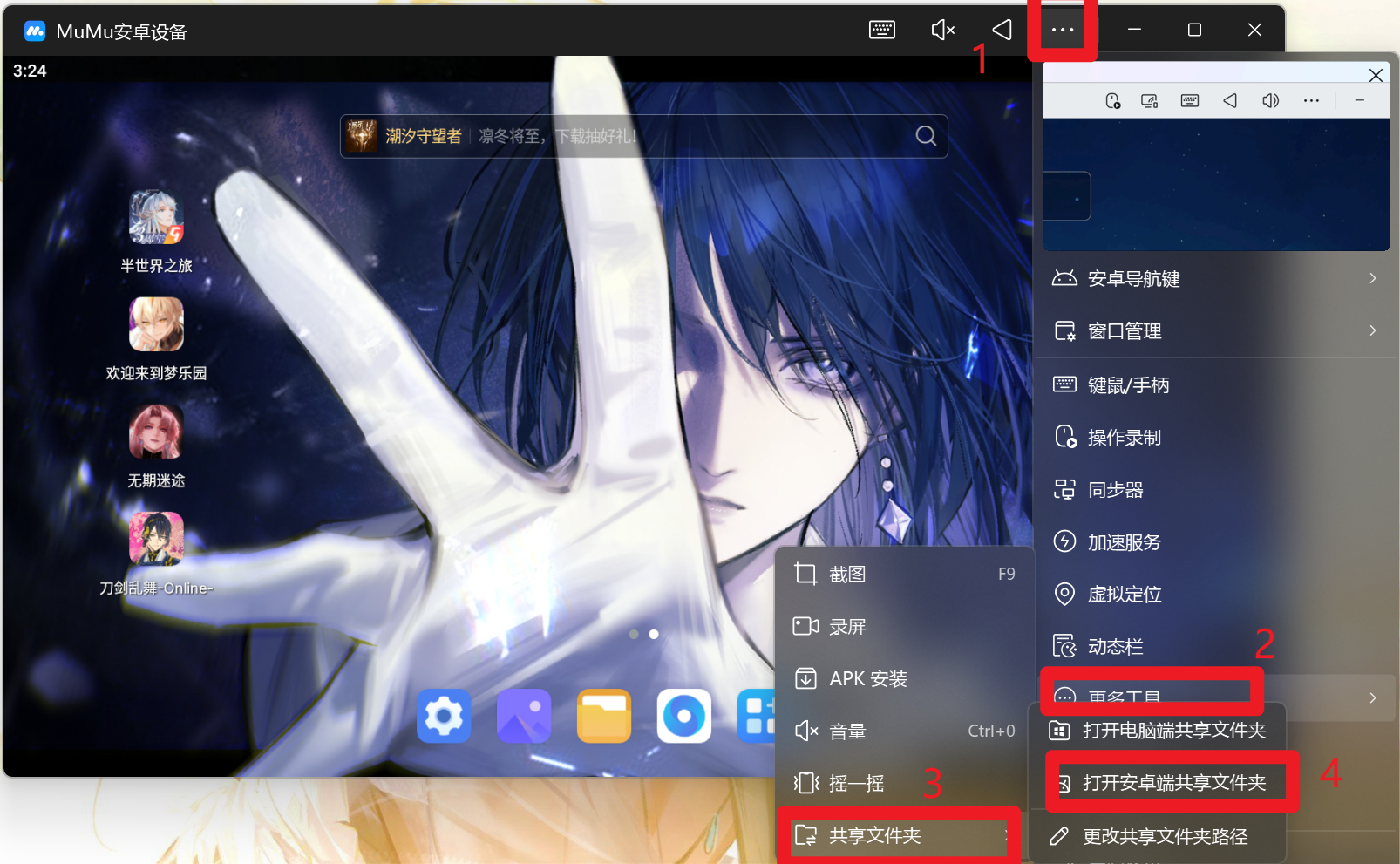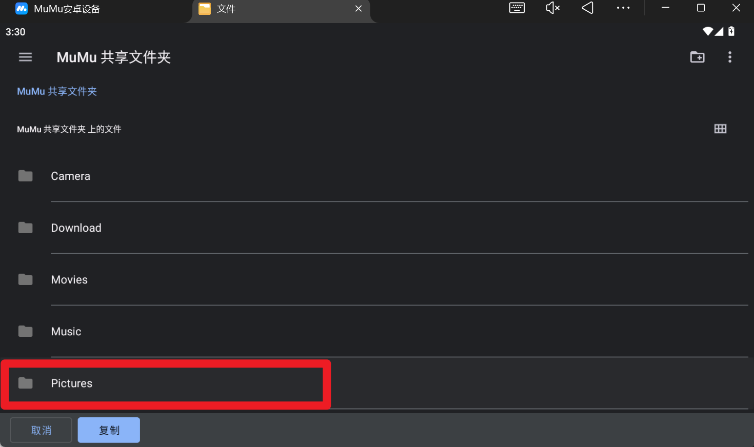 首先根据以下步骤打开mumu共享文件夹,查看文件”Pictures“和”Download“有没有无期相关的图片。如果没有,就可以按照后续步骤操作了。