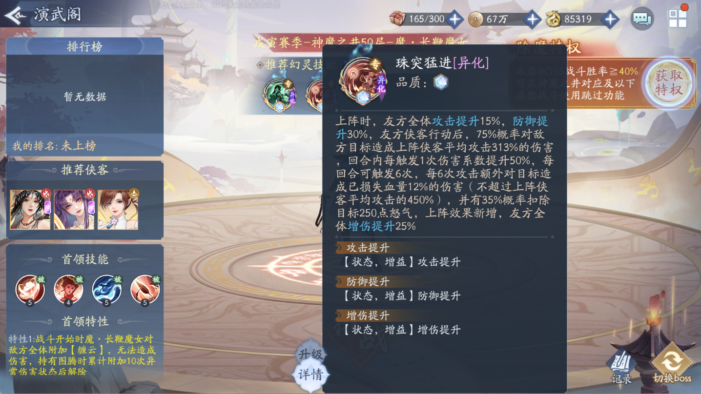 【珠突猛进】这是一个比较强势的攻击型技能,提升友方全体攻击与防御,对敌方目标造成上阵侠客平均攻击 百分比 的伤害,回合内每触发1次均有伤害系数提升,且每回合可触发6次,每6次攻击额外对目标造成已损血量百分比的伤害,可移除魔·长鞭魔女的特性——【凝丝】,并有概率扣除目标怒气,白色品质带有提升增伤的效果,属于攻击型较为强势的技能