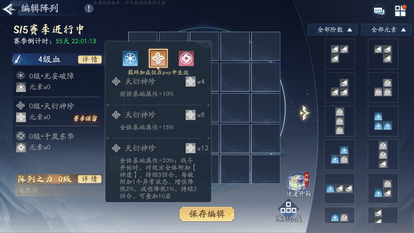 天衍神珍(基础+随异常双减/赛季保留):全体基础属性 + 20%;战斗开始时,对敌方全体附加【神谴】,持续 3 回合,每被附加 1 个异常状态,增伤降低 2%,减伤降低 1%,持续 2 回合,可叠加 10 层