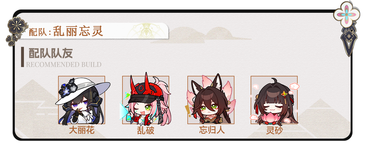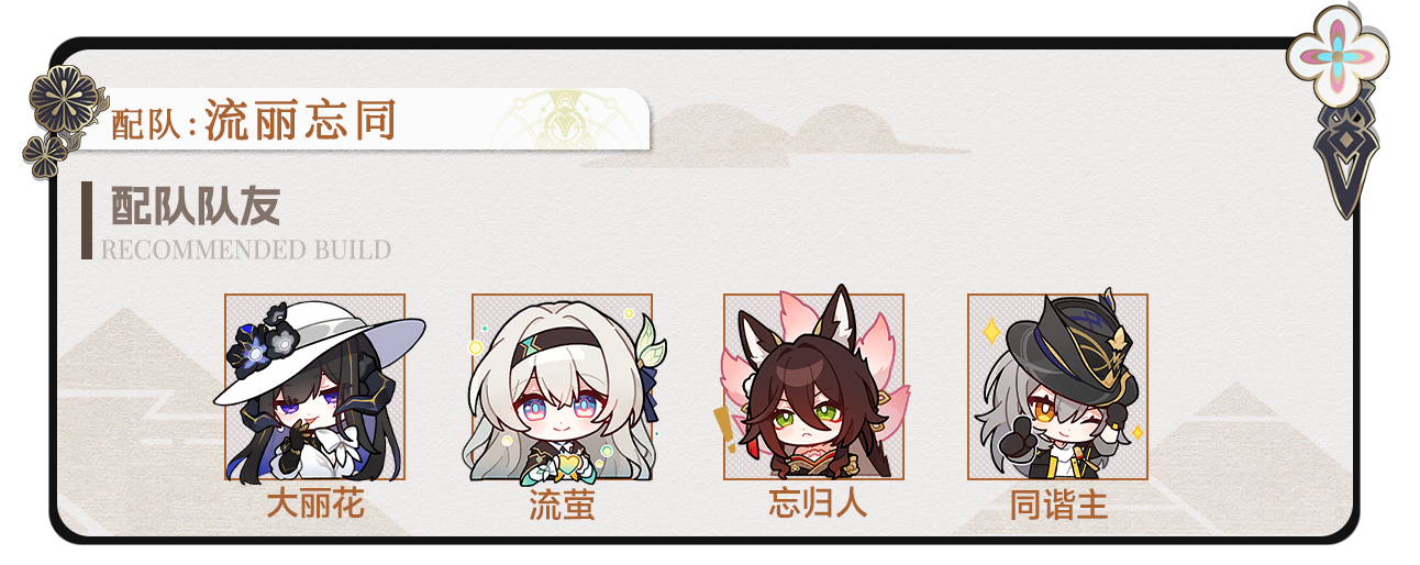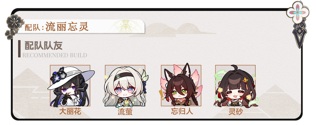【介绍】该队伍中,大丽花提供击破前出伤的机制与击破特攻,防御降低,击破效率,速度提升和少量超击破倍率的属性加成,忘归人提供对应的超击破倍率与一定的击破特攻属性加成,流萤则作为驾驶员利用大丽花与忘归人提供的效果打出大量超击破伤害,并优化循环。灵砂则在保证队伍生存的同时,提供击破易伤与一定辅助削韧,并可以通过治疗效果持续触发大丽花的击破特攻提高效果。