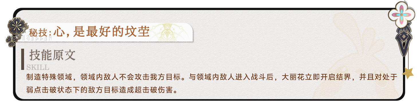 【解析】大丽花在施放秘技后,将会展开一个使敌方无法攻击我方的特殊领域,而通过施放秘技后进入战斗,大丽花可以立即展开战技的结界,提升其核心机制的覆盖率,并使入场时造成的对应属性韧性削减效果额外附加60%的超击破倍率。