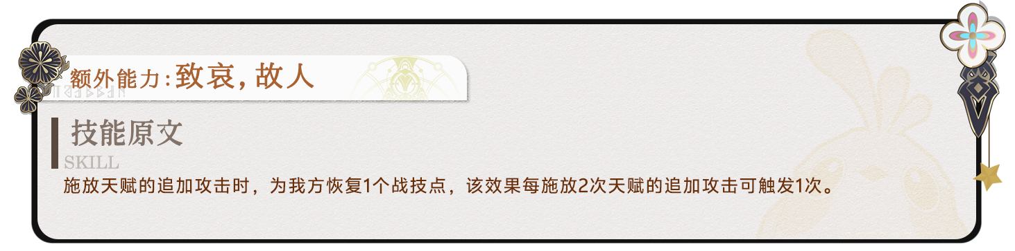【解析】此额外能力是对大丽花追加攻击的强化效果,在解锁该额外能力后,大丽花首次与后续每两次施放天赋的追加攻击时,都可以为我方恢复1个战技点,该效果充分供给大丽花的战技点产出自循环,配合上普攻可以做到6动额外产出4+3-2=5个战技点,从而为0魂流萤/灵砂等角色提供较为优秀的战技点循环,保证其输出空间。