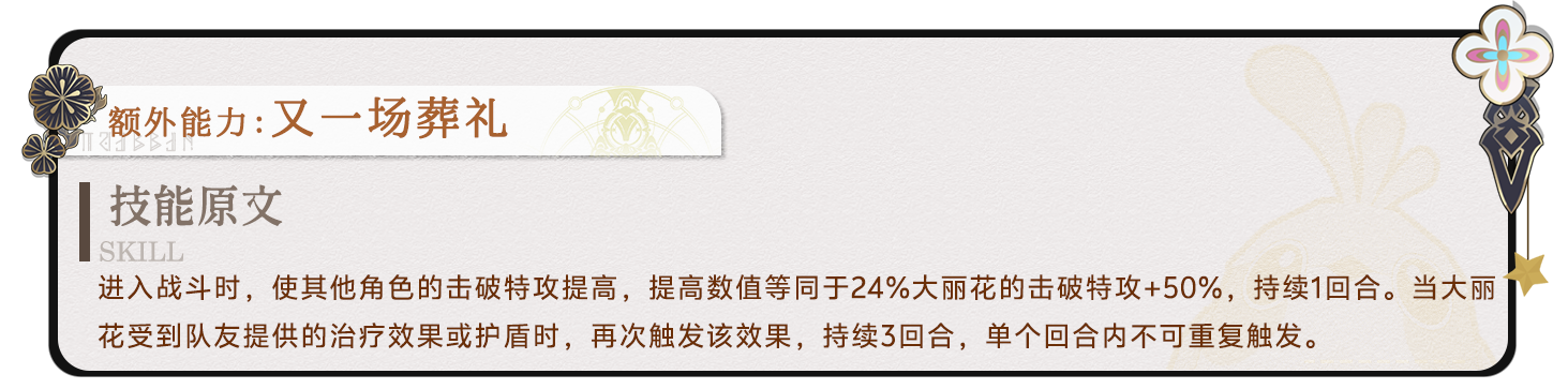 【解析】此额外能力是对大丽花辅助能力的强化效果,在解锁该额外能力后,大丽花在进入战斗或受到队友提供的生存效果时,可以使队伍内其他角色提高120%+的击破特攻(按0+1约300%击破特攻来计算,且大丽花星魂对该效果有强化),为队伍内的主要输出角色提供25%+的输出提升幅度。不过,该效果若要持续生效,则对治疗角色存在一定需求,三拐一时无法生效。