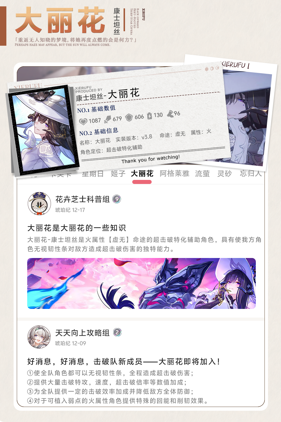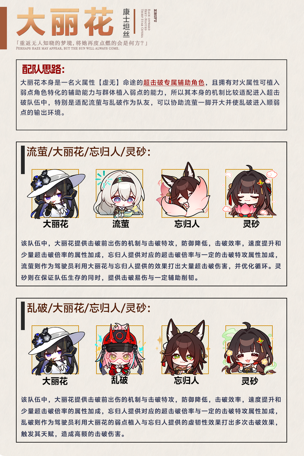 大丽花本身是一名火属性【虚无】命途的超击破专属辅助角色,且拥有对火属性可植入弱点角色特化的辅助能力与群体植入弱点的能力,所以其本身的机制比较适配进入超击破队伍中,特别是适配流萤与乱破作为队友,可以协助流萤一脚开大并使乱破进入顺弱点的输出环境。