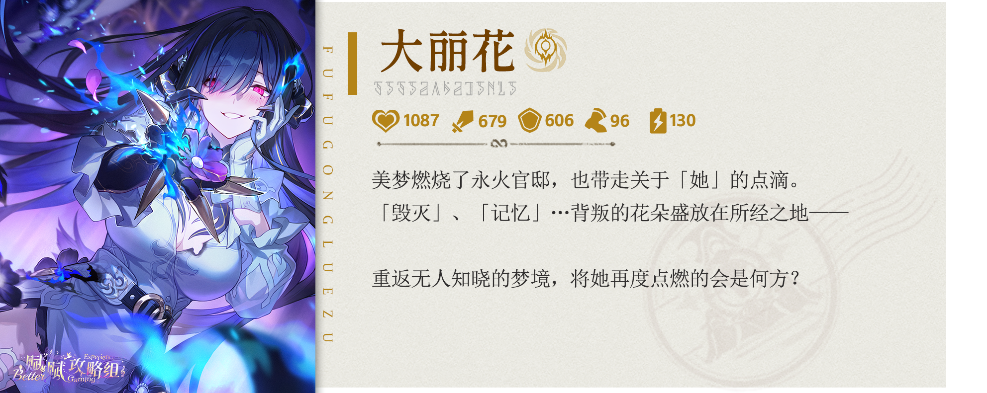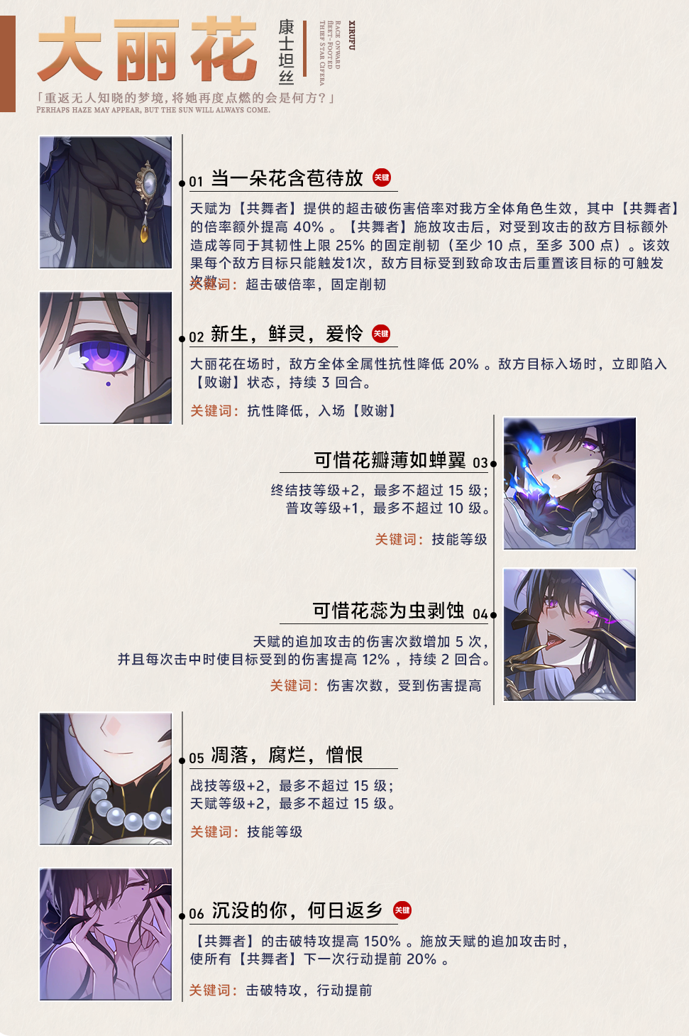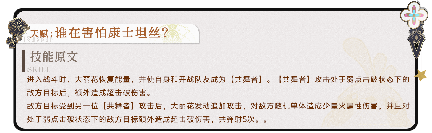 【解析】大丽花的天赋是对其机制的补充,可以为【共舞者】角色提供超击破倍率辅助能力补充与为其提供一定的能量回复与少量带额外超击破倍率的火属性韧性削减效果。