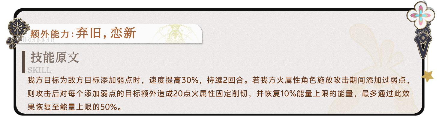 【解析】此额外能力是对大丽花辅助能力的强化效果,在解锁该额外能力后,大丽花可以在我方目标为敌方目标添加弱点时,使其速度提高2个回合,该效果在击破/超击破队伍中通常可以被流萤/波提欧/大丽花等角色触发,通过速度提升提升角色自身的出伤速度与攻击频率,减少每次行动所消耗的行动值,从而大幅提升队伍的总伤。此外,该额外能力还可以提供在当前版本中仅对流萤与大丽花生效的特殊效果,我方火属性角色施放攻击时添加弱点,则攻击后对每个添加弱点的目标额外造成 20 点火属性固定削韧,并恢复10%能量上限的能量,该效果通过强化固定削韧效果,提升了流萤与大丽花单次攻击造成的削韧值,从而转化为对应的超击破伤害,提升队伍的总伤,并通过每次攻击恢复10%能量上限的能量的效果,使流萤可以轻松在每次终结技期间恢复50%的能量,从而实现“一脚开大”,减少流萤暖机消耗的行动值,对其输出机制与结构进行优化,大幅提升其输出能力。