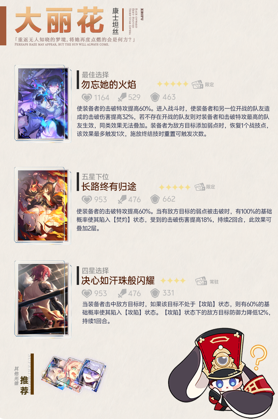 崩坏:星穹铁道【V3.7攻略】大丽花前瞻攻略,涵盖配装选择、配队推荐、技能加点如下: