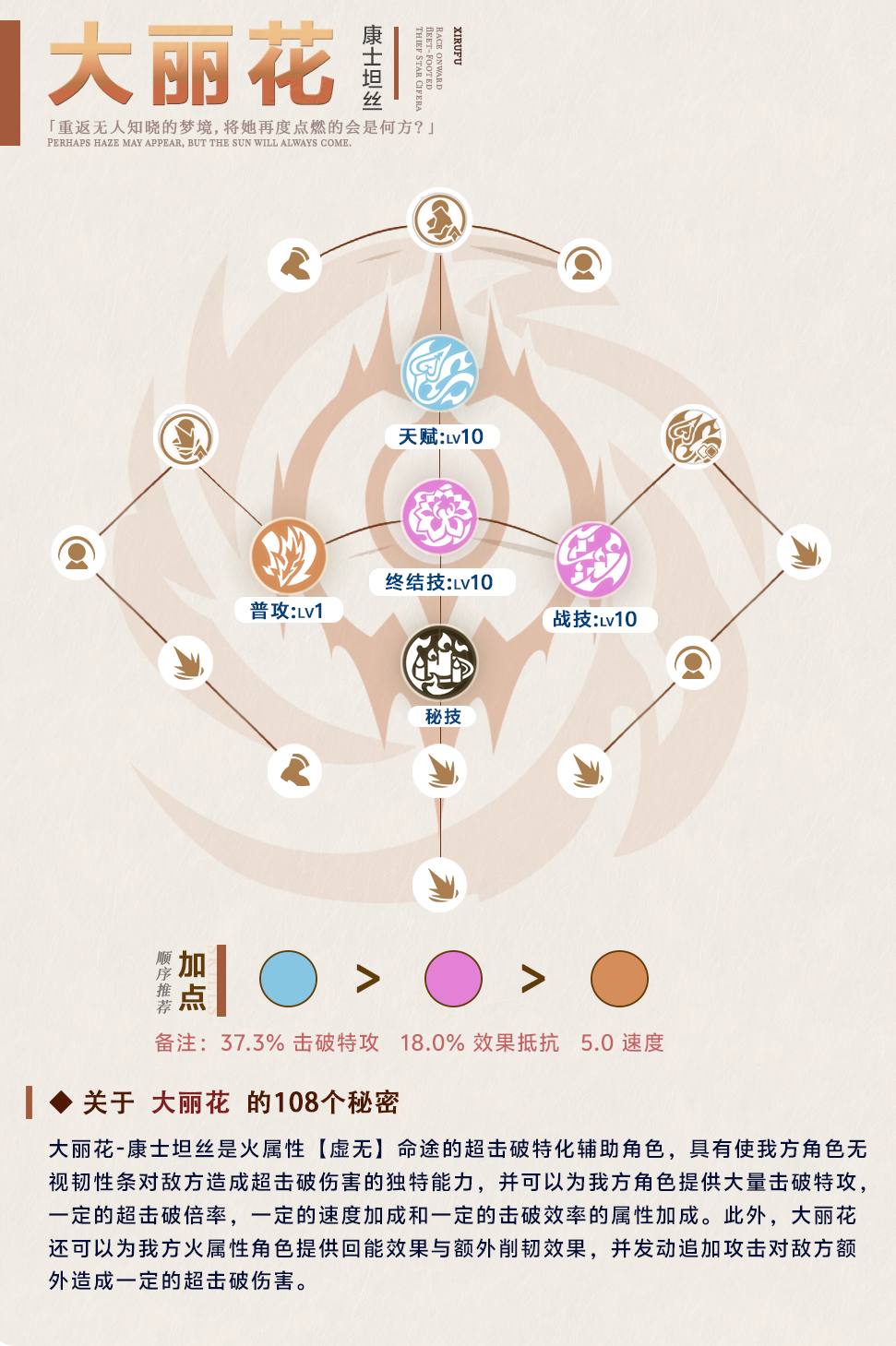 大丽花-康士坦丝是火属性【虚无】命途的超击破特化辅助角色,具有使我方角色无视韧性条对敌方造成超击破伤害的独特能力,并可以为我方角色提供大量击破特攻,一定的超击破倍率,一定的速度加成和一定的击破效率的属性加成。此外,大丽花还可以为我方火属性角色提供回能效果与额外削韧效果,并发动追加攻击对敌方额外造成一定的超击破伤害。