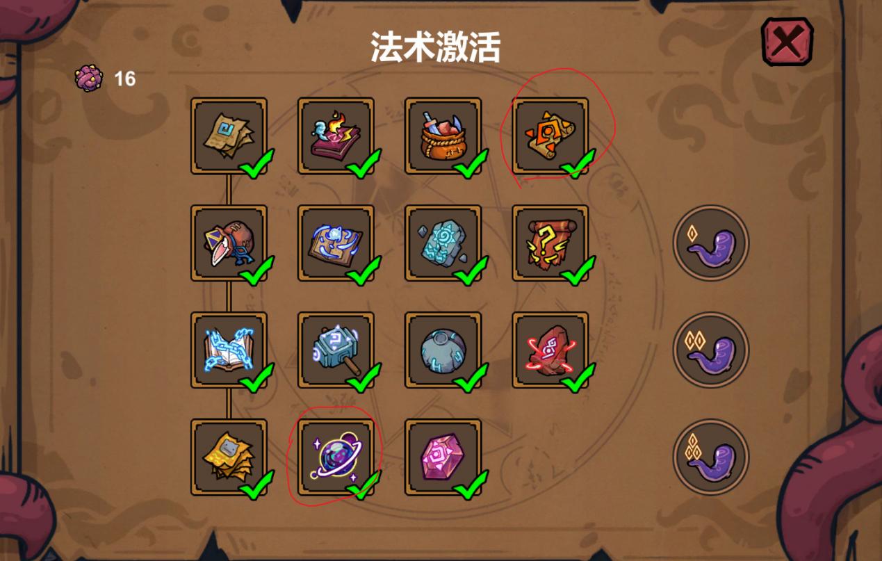右上角特性加成里食腐舌簇和捷径在后期特别重要,食腐舌簇可以获得独特法术。操作方法是在洞的旁边把法术推下去,就可以得到新的法术。捷径可以加快游戏进度,每局可以节省很多时间。