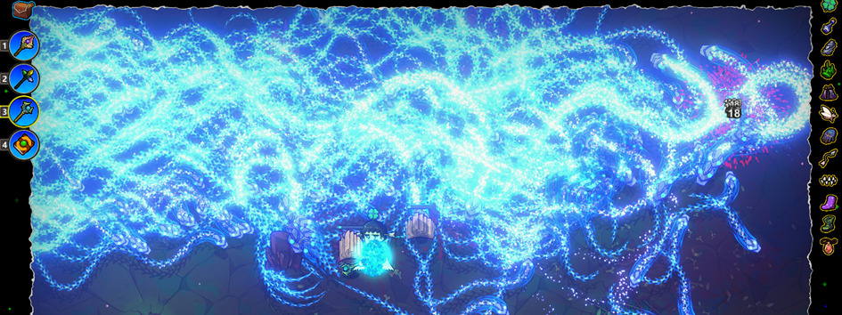 冥蛇搭配了自动导航之后可以自动寻找敌人,然后再加上多重射击,一次三条蛇出去,三条蛇消失的时候会分裂成9条小蛇自动寻敌,再加上加速器的加速和冰霜结晶的冰冻!