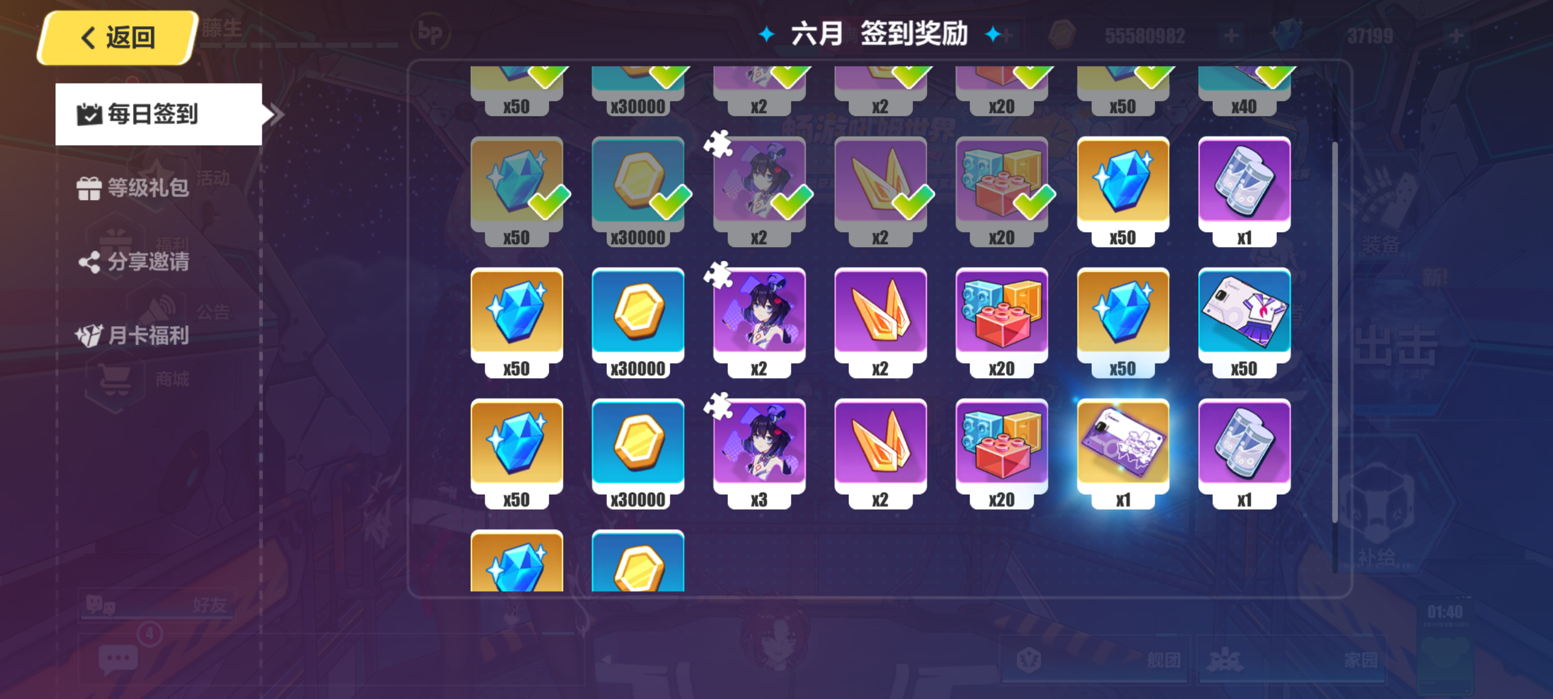 每日签到一个月可获得400水晶+1张家园补给卡。