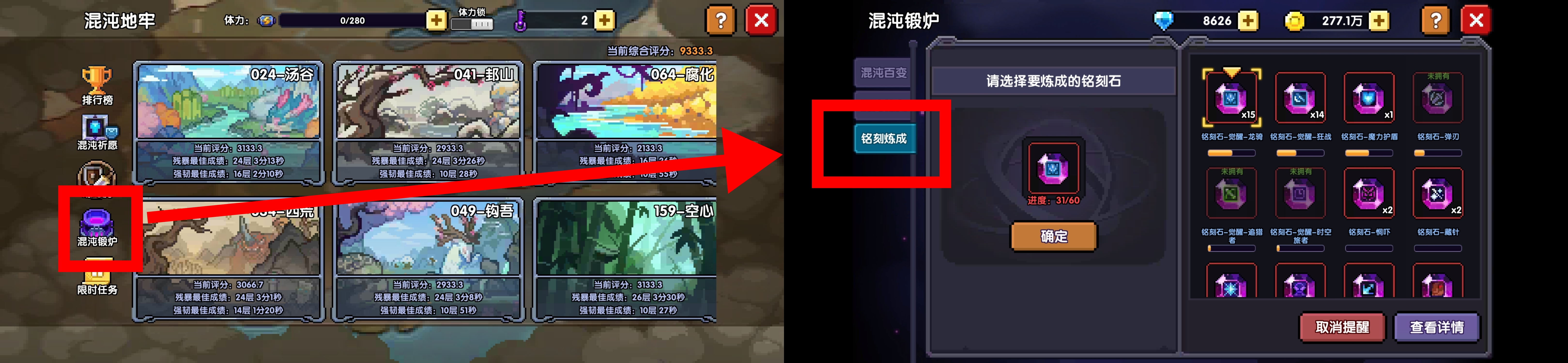 由于混沌地牢中装备的刷取需耗费大量体力,在刷齐3级混沌特性的最优搭配装备后优先把体力投入于宝石资源本中,不必强求全身太古。