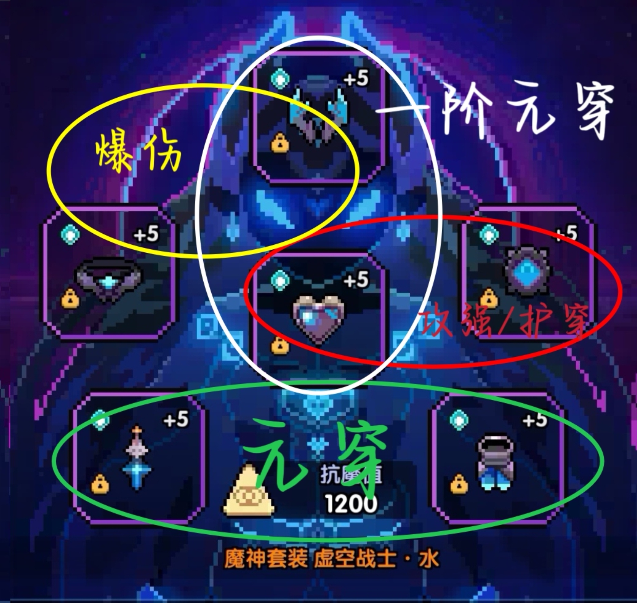上方的图就是二阶外装主属性的挑选,主属性正确、带有两条腿的就是毕业外装,严格按照图中来即可。