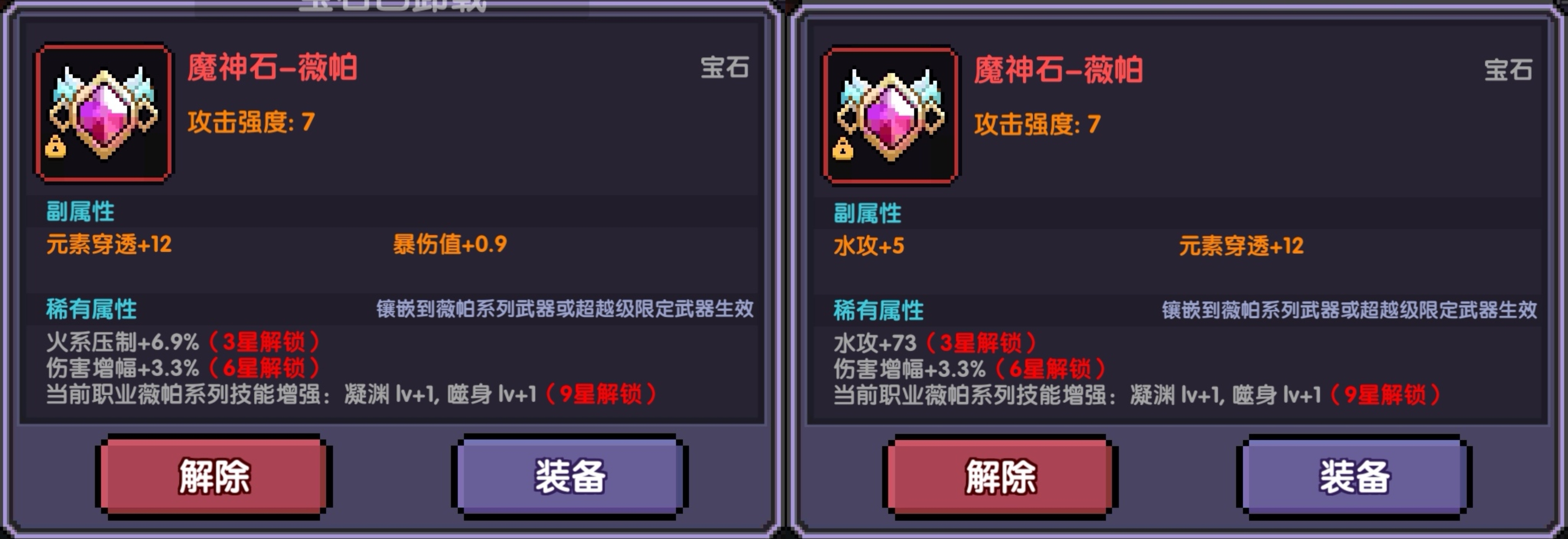 属性洗练也与上方一致。上图中,左图为大秘境、世界用的,右图为打桩、竞技场用的。