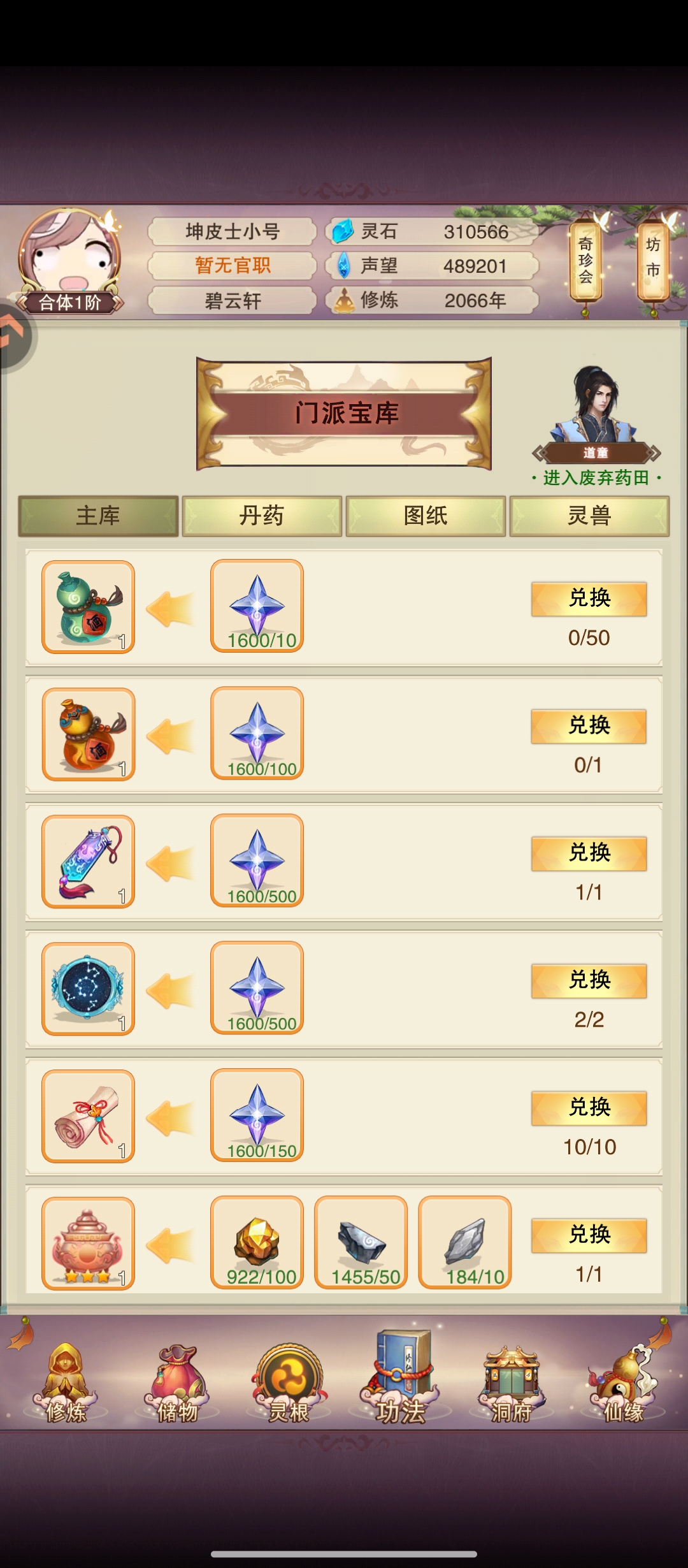 元婴期间除了12点和24点去坊市刷攻防闪,就是算好时间刷门派了。青羽门秘诀需要900贡献需要30个小时,第二天开始需要开始换红酒之后一直不断,一天100贡献两天就是200贡献,需要6~7小时,正好在第三天的时候可以换到青羽秘诀刷4星门派(别忘了用技能点优化攻防),刷到隐神或者九煞就可以进去了(推荐隐神,可以悟丹方,也可以早点炼丹),这次的贡献需要先升级职位到真传,然后再换秘诀(攒贡献换秘诀的同时去学炼丹炼器)。