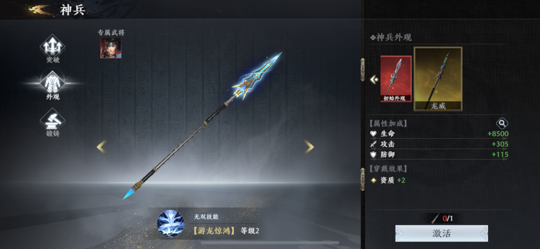 神兵基本规则1.每个武将都拥有专属神兵,激活武将后可消耗对应道具激活神兵;2.神兵激活后,对应武将的无双技能和副将技能解锁,并为神兵增加基础特效;3.神兵突破后可以提升其基础属性或无双技/副将技的技能效果,其最高突破等级不能超过武将的突破等级。