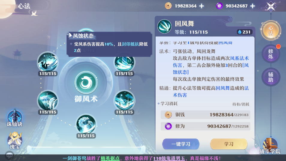 【龙灵】:召唤持续 7 回合的风龙之灵,出生时立即行动一次,自带【风速光环】(提升己方全体速度,提升量 = 等级 ×0.3);风龙之灵优先攻击有【风蚀状态】且速度最快的敌方单位,每回合出手后额外对未攻击过的目标施放回风舞;若敌方目标被【悬空】,风龙之灵会额外施放回风舞攻击该目标;