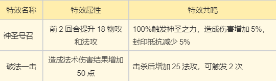 【神圣号召】:前 2 回合提升 18 点物攻与法攻,100% 触发神圣之力,造成伤害增加 5%(需牺牲 5% 封印抵抗),适配开局抢节奏需求;