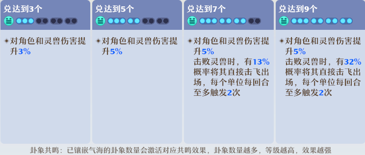 【兑卦】:核心提升对角色和灵兽的伤害,兑卦数量达 5 个时,击败灵兽有 13% 概率将其击飞出阵;达 7 个时,击飞概率提升至 32%(每个单位每回合至多触发 2 次),适配清宝宝与守尸战术;