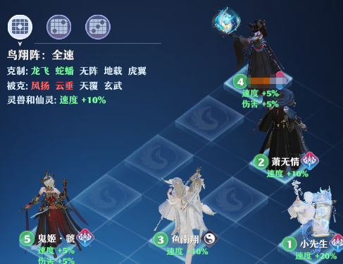针对群英榜、洞天探秘、英雄帖等玩法,推荐 “4 鬼道 + 鸟翔阵” 的极限速攻阵容,具体配置为【小先生】【萧无情】【鬼姬・虢】+【鱼南翔】: