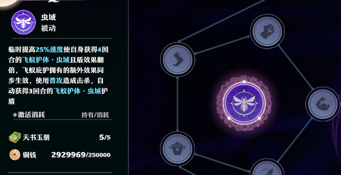 【虫域】:可临时提升 25% 速度,使自身获得 4 回合的飞蚁护体・虫域护盾(效果翻倍),飞蚁庇护的额外效果同步生效;使用普攻击杀目标后,自动获得 3 回合的飞蚁护体・虫域护盾。实战中,若被集火击杀,复活后可通过该技能提速开盾,有效防止被高速物理守尸,是高效的反击策略!