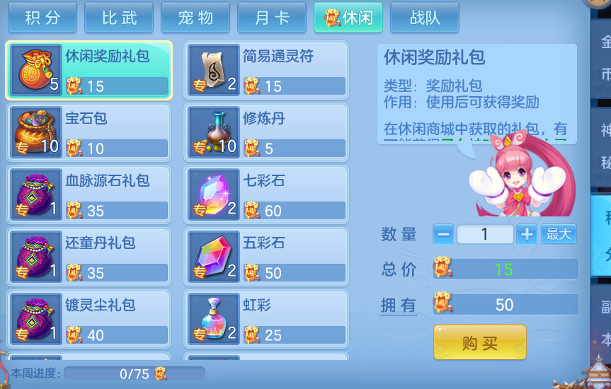 参加一些周末的限时活动,然后钓鱼、玲珑遗迹这些小玩法都会提供休闲积分,推荐换宝石袋、剩下看自己。