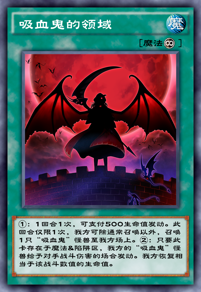 这个时候如果起手有一张吸血鬼的领域那将是绝杀,这张卡可以通过一回合一次支付500生命值增加一次召唤吸血鬼怪兽的机会,因为这张卡的存在我们就可以在召唤妖女吸血鬼之后召唤吸血鬼怪兽触发妖女吸血鬼的效果,通过牛走对手攻击力大于2000的怪兽来使得攻击力暴涨并进行反打,同时因为吸血鬼的领域的效果我方吸血鬼怪兽给予对手战斗伤害的时候我方会回复相同的生命值,不仅攻击高而且血量也相当扎实,就可玩性来说比之前提升了不少。