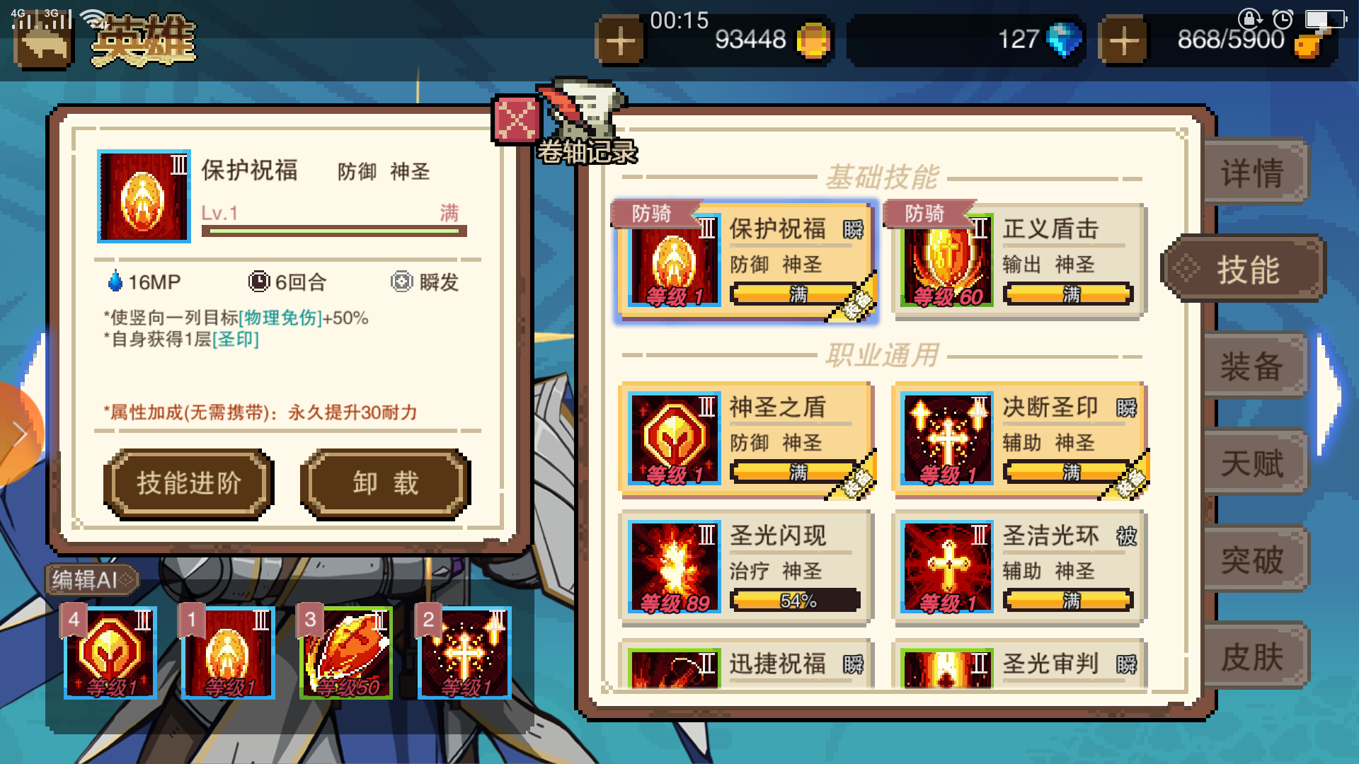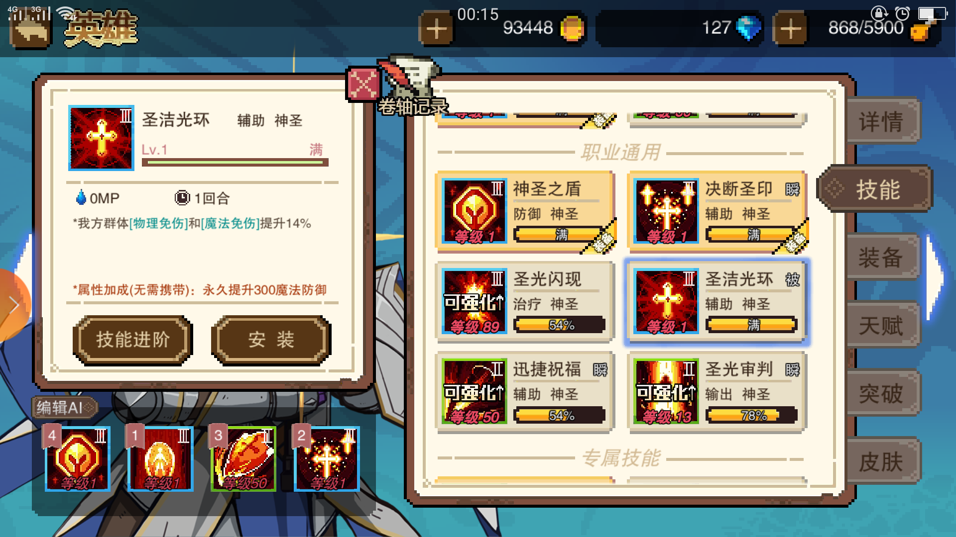 此时此刻,我并不想说什么。光是什么不做,只要装上就可以获得全队15%的伤害减免,我就已经对于这个技能充满了敬意。我曾经就靠着这一些辅助技能。相差两千多战斗力的对手都打不过我。