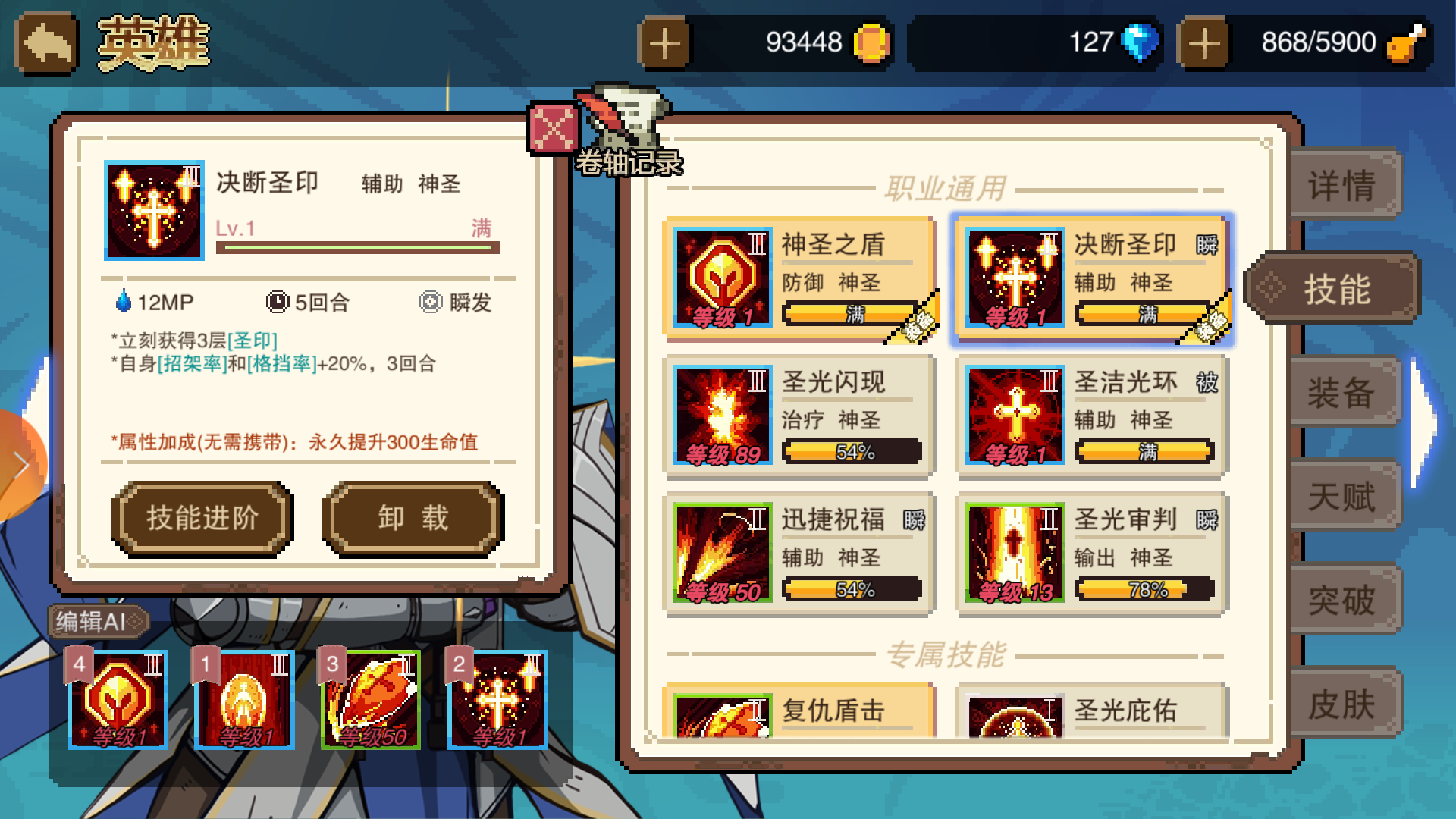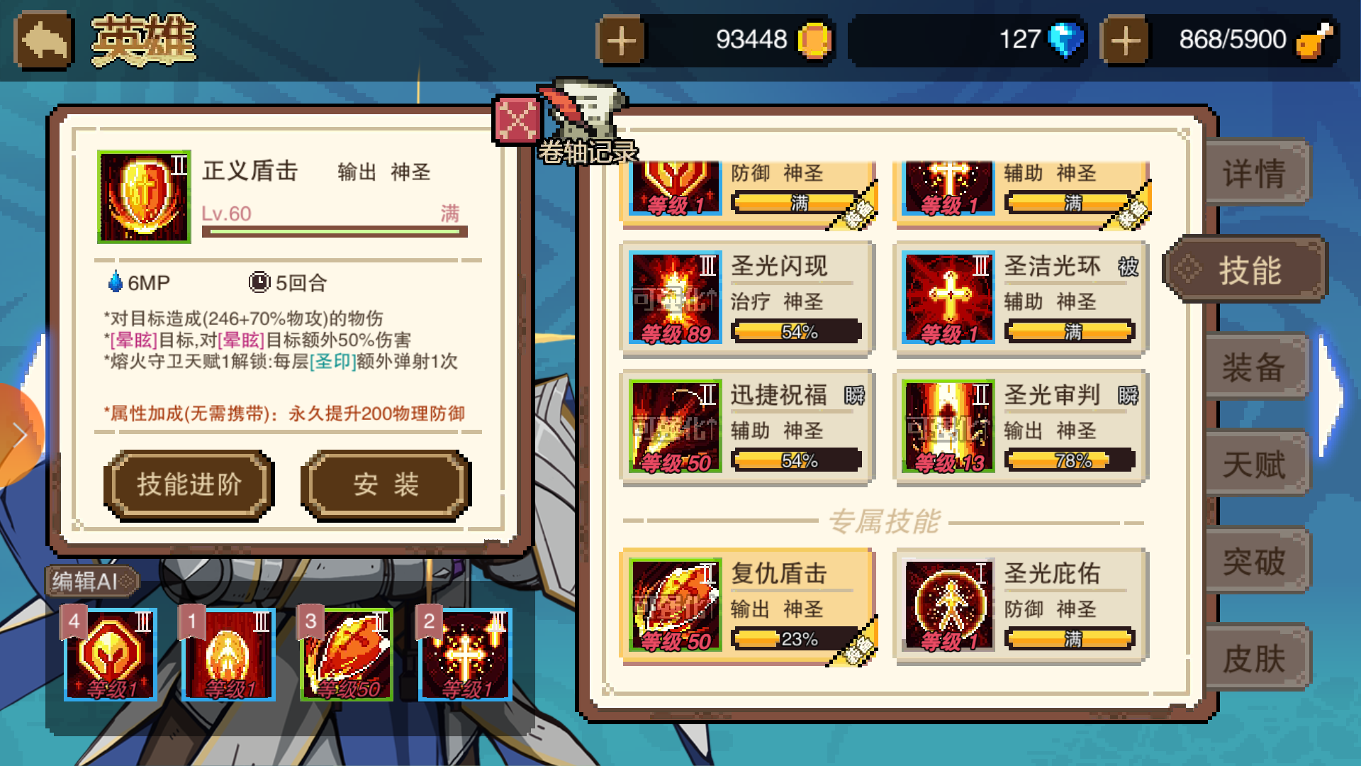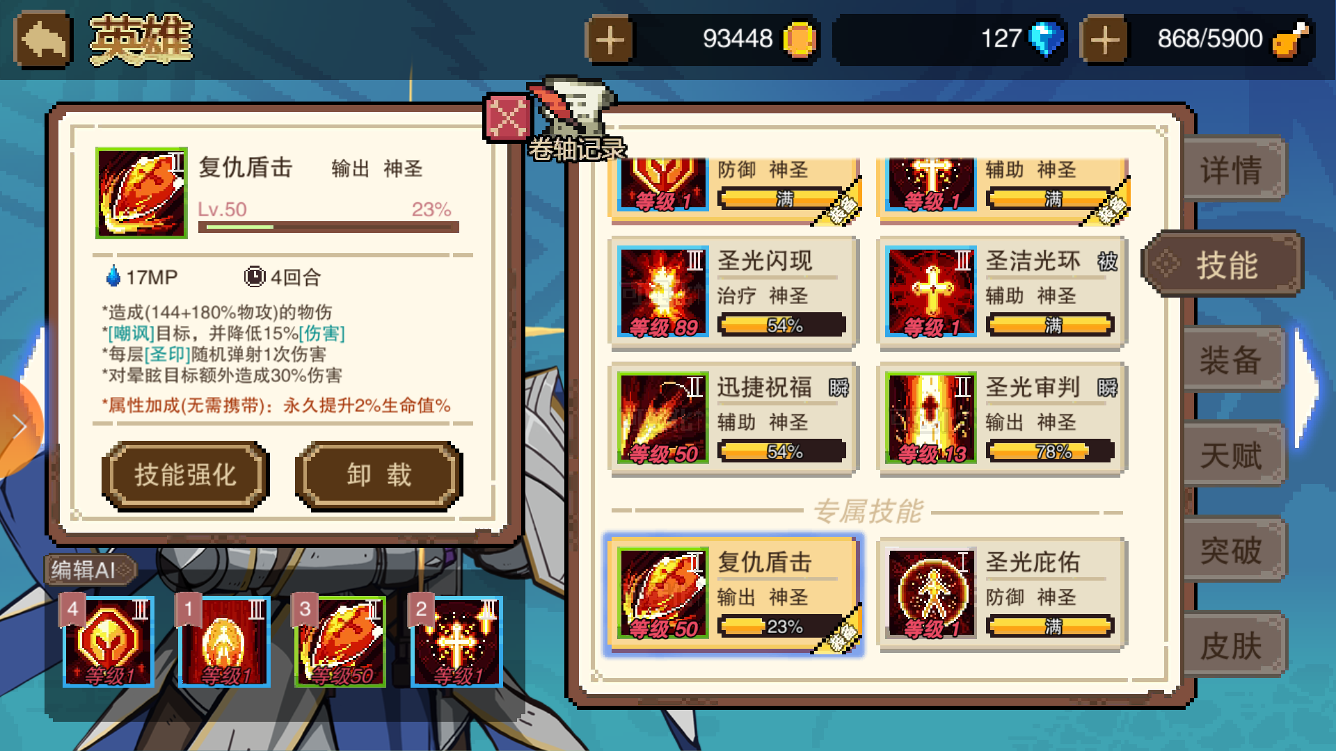 仍然是一个骚的一批的技能。配合上面的技能使用会有意想不到的效果。因为这个会对学员的目标额外造成一定的伤害,所以说神圣盾击的眩晕效果,配上眩晕加伤害,输出的效果非常可观。