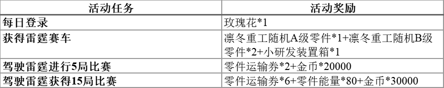 赛车手大大们~为了尽快提升刚刚获取的雷霆赛车,菲菲特地准备了雷霆的资源联动活动呦~获得雷霆赛车的车手大大们只要在活动期间(6.25-7.8日)完成指定任务,即可获得各类丰富的游戏道具,快来加速雷霆的进化升级吧~