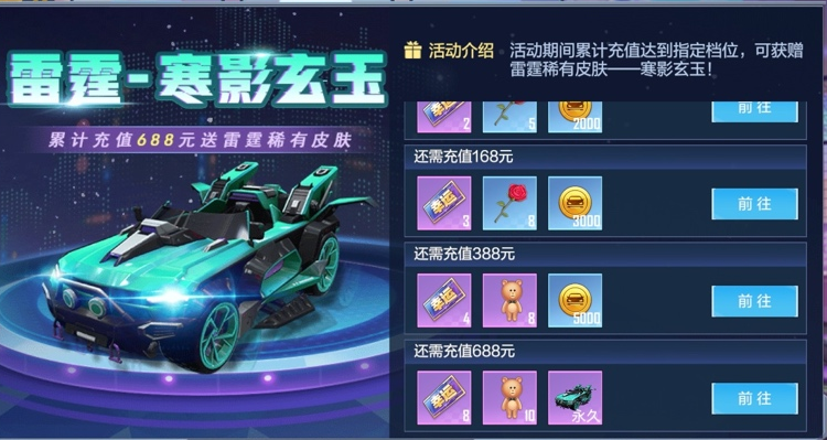 刚拿到的新赛车~怎么能不准备一套新皮肤来搭配呢?雷霆专属限定皮肤的获取活动同步上架啦~除了能够获得幸运抽奖券以及玫瑰花、布偶熊等道具外,在活动期间(6.25-6.27日)累计充值达到指定档位(仅计算钻石充值档位),即可获得雷霆限定皮肤——寒影玄玉呦!