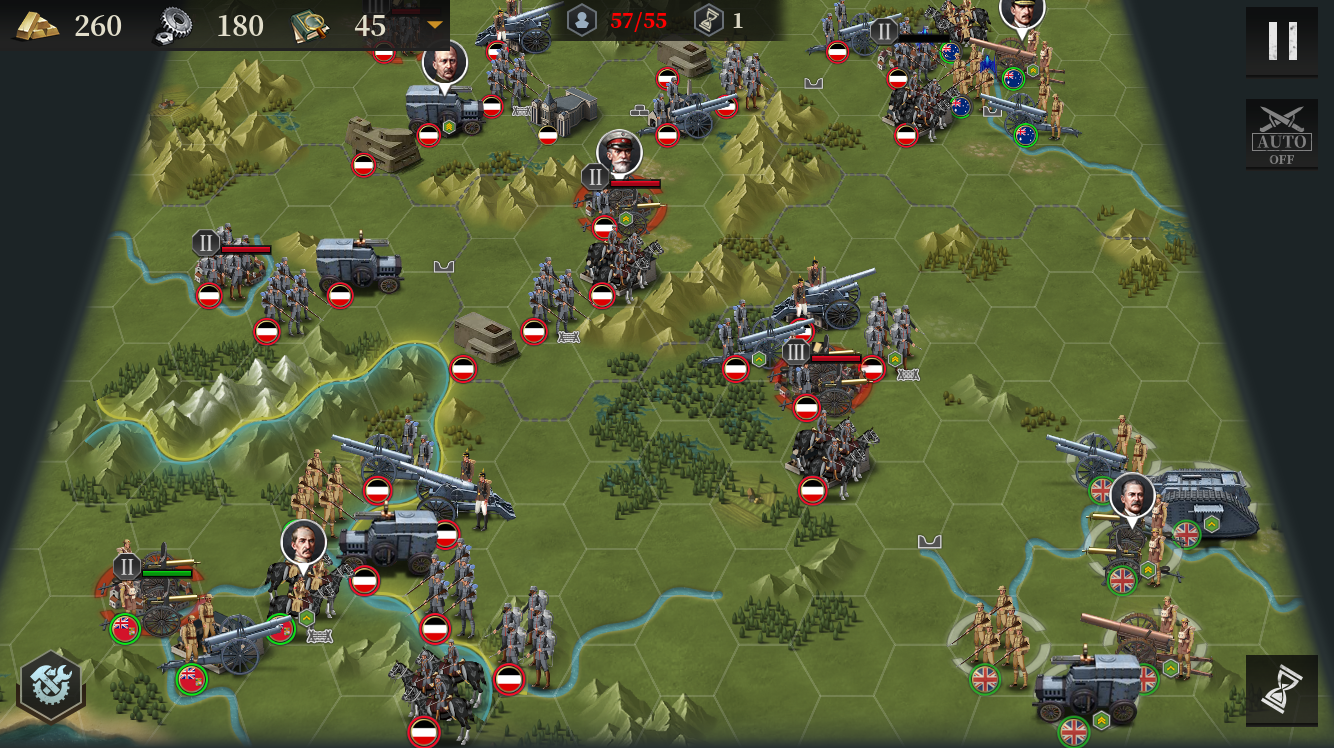 第一回合,给炮兵上将,坦克和胸甲骑兵上将(记得带好回血装备,本关主力就是这3个骑兵),注意下海后不要跑太远,尽快登陆上岸。上方先清理掉要塞,然后左侧的友军会开始行动,帮助推进。下方则是稳步推进,尽量不要陷入包围,能直接收割敌方小兵的情况下也是这样。如果友军还算给力的话,一般下方中间的城市可以先占领,此时就可以出兵防守一下,敌军会有骑兵将领上来,一定不能给机会反推。上方的坦克找好空挡进行绕后,并先站住敌人的出兵建筑,然后下回合再移动躲开要塞攻击。占领上方城市的同时,右下的城市也基本被我方的兵包围了,直接围攻占城即可。